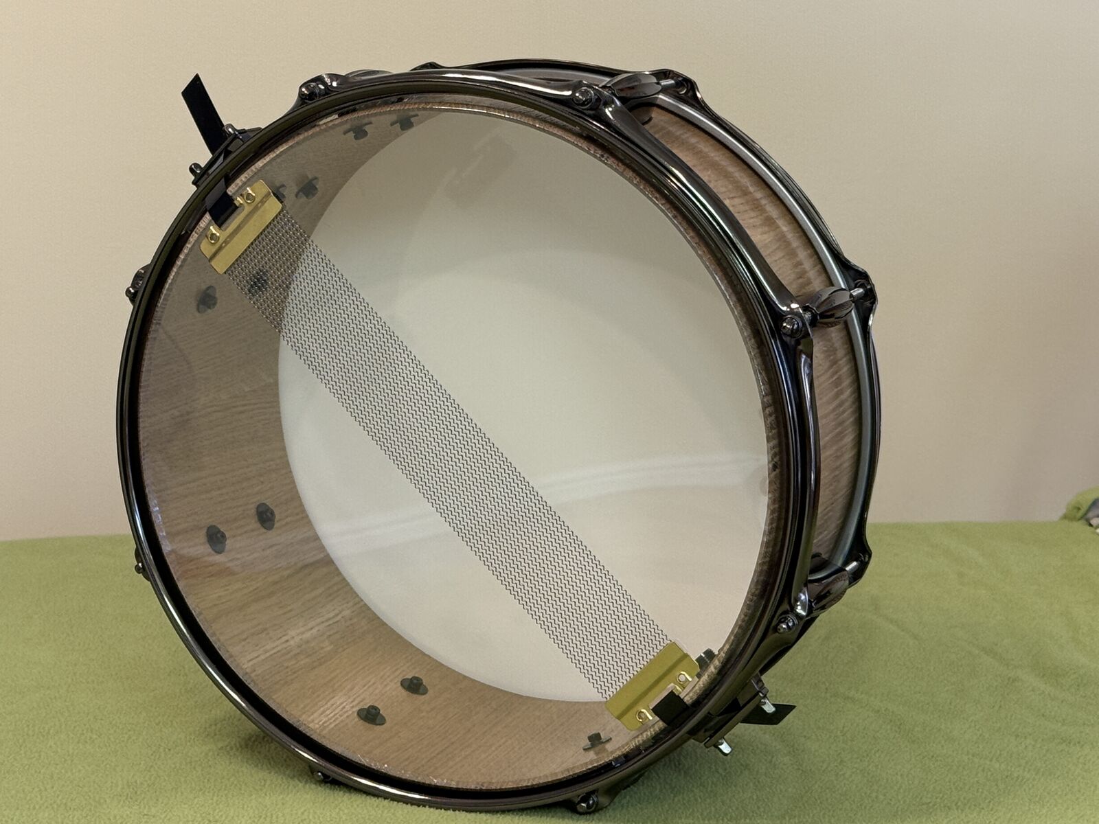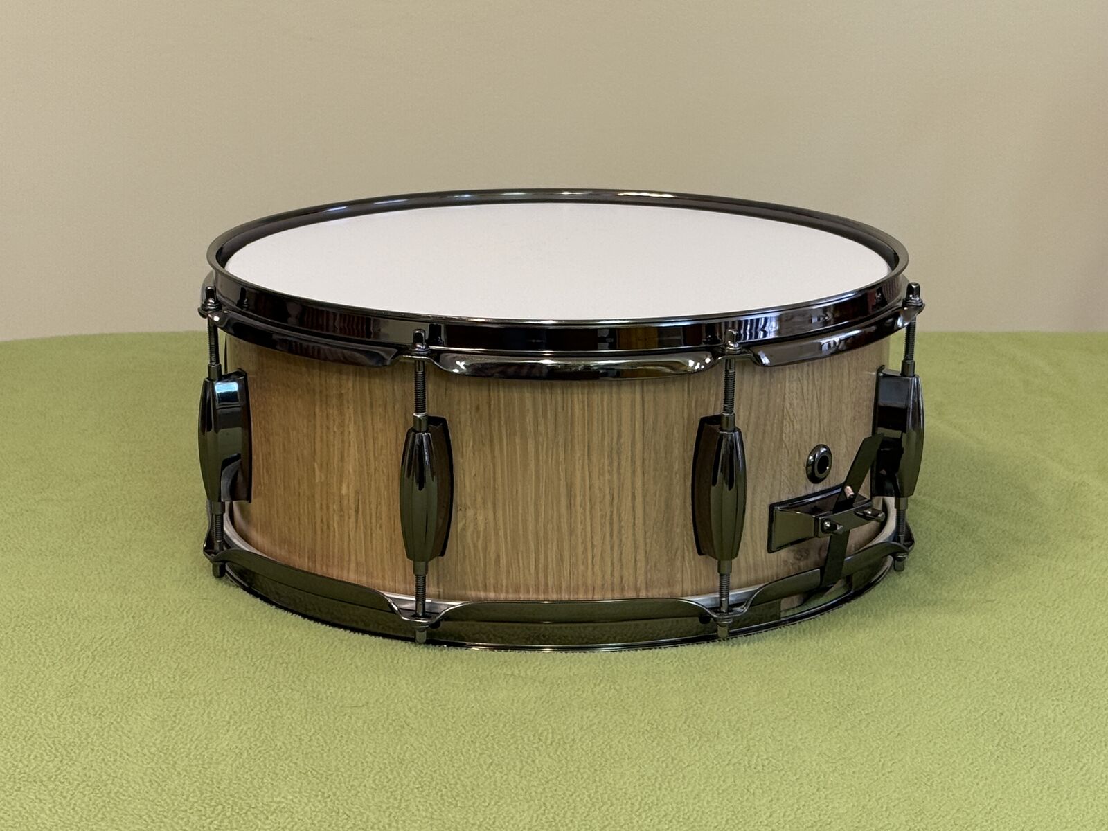 VenmoNatural Oak Stave Snare Drum 6 x 14 Black Brass 2.3mm triple flanged 8 hole hoops Black Brass strainer and butt plate Black Brass lugs (8)