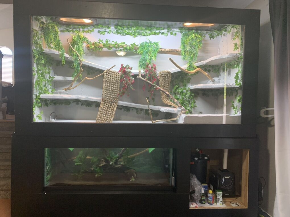 Needing to re home our 6 year old male Chinese Water Dragon. He is in great health and is very easy going. Never had an issue with biting or whipping when being handled. We are new parents and don’t have the time he deserves to have. He comes with a 91.5” L x 31.5” D x 83.5” H custom enclosure. The enclosure we built ourselves. It has a 75 G aquarium, water heater, Fluval Fx6 filter, auto lights and thermostat. The inside is sealed and covered with 1.5” thick foam that has several climbing areas with different temperature spots for comfort. Vents are drilled on both sides of the enclosure for air flow. 2 dome lights that each have a basking lamp and thermal heating bulb. 1 long uv bulb sits in the front of the enclosure as well. All lights are programmed into the controller to turn on and off. The enclosure is very large and heavy. You will need a minimum of 4 people to move the enclosure. The top half does come off the bottom, which is the heaviest and most difficult part to move. The bottom is on 8 wheels which makes it easy to move with 1 person for maneuvering and maintenance needs. Please message me with any questions you have. The price is $800 OBO.