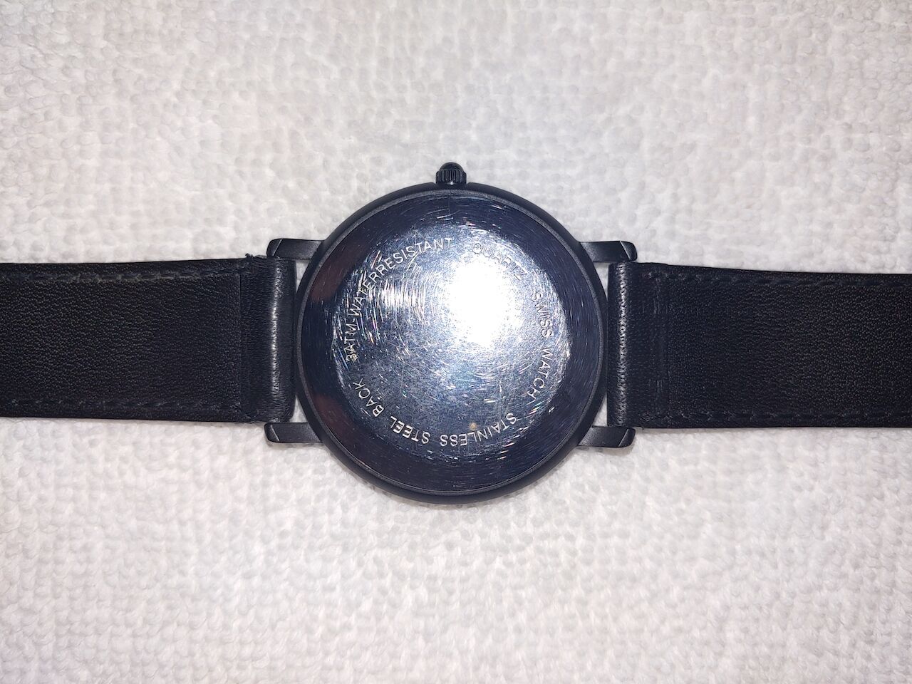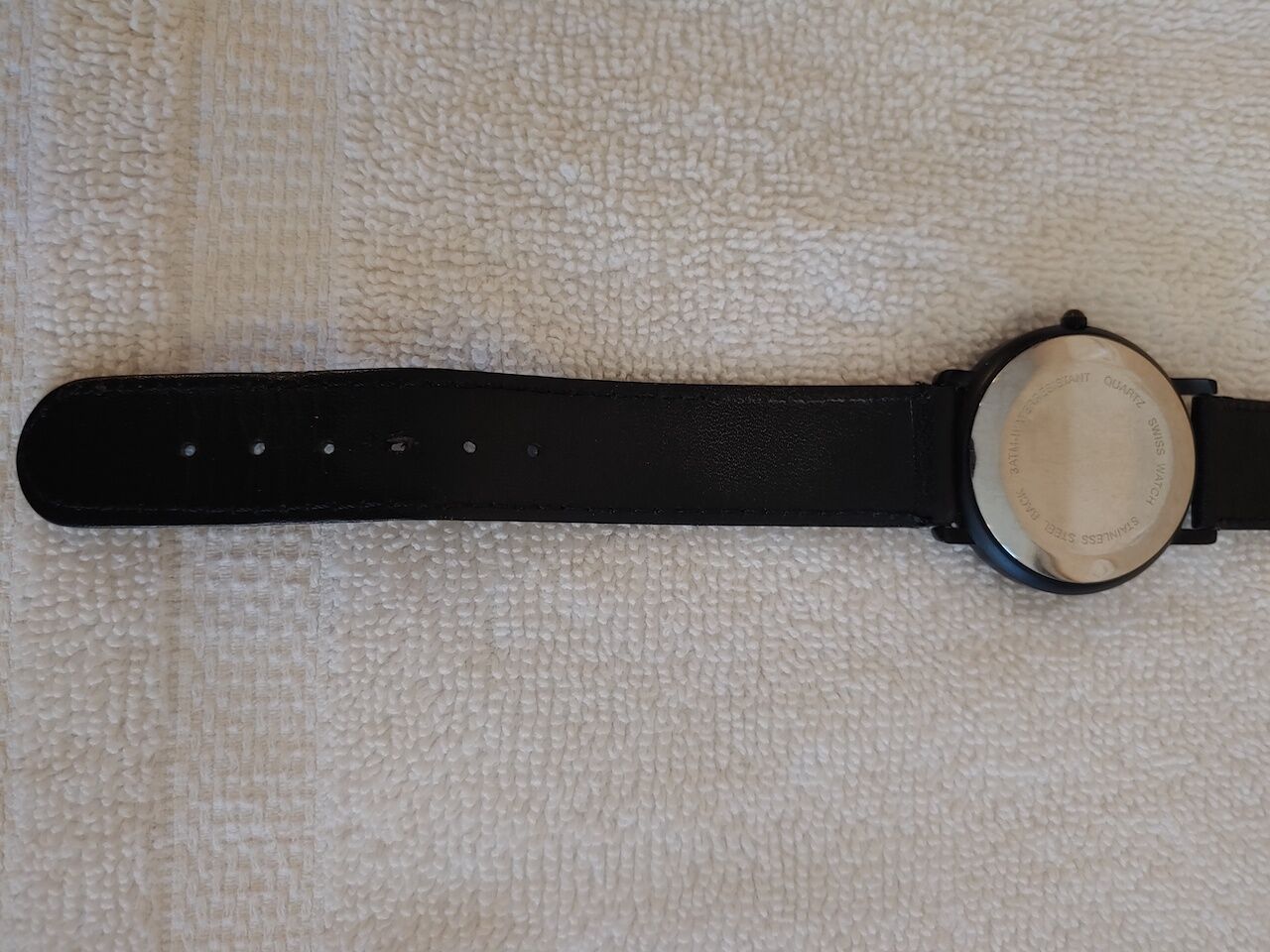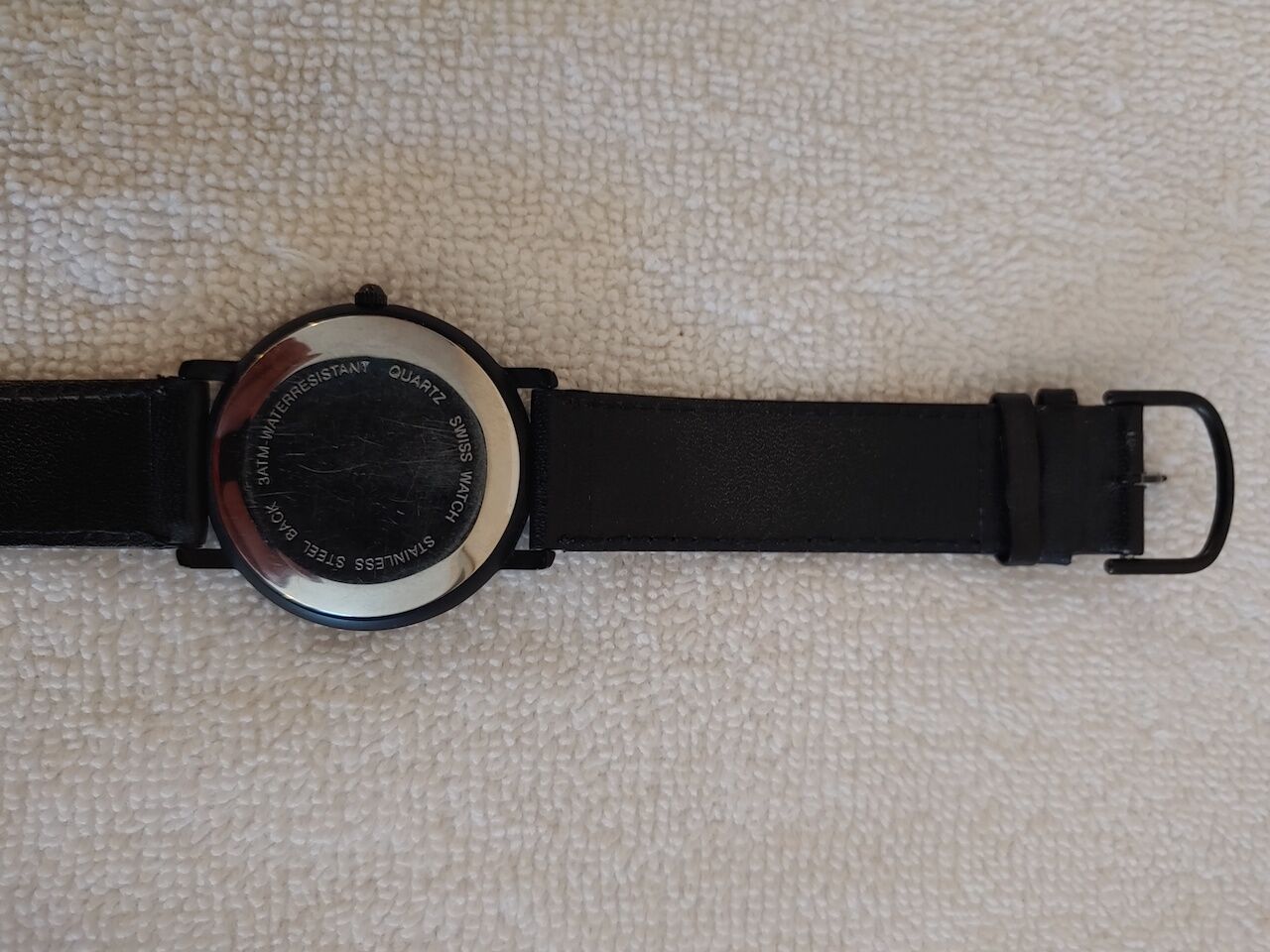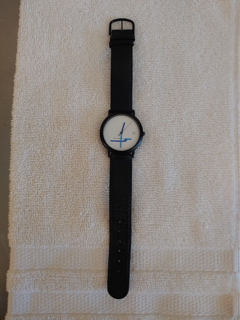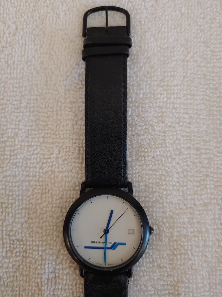 This stunning and rare vintage anniversary watch is made of stainless steel, quartz and is 3atm water-resistant. It is a Swiss made watch with a white dial and sports the Two Tone Blue Muller Martini Logo, along with Müller Martini script written in black and a display of the day of the month. The wristband is made of black leather and is easy to adjust or take on and off. I have worn this watch Maybe a half dozen times in the last 30 years. It is in amazing condition. A total blast from the past for anyone that has worked in the Publishing Industry.