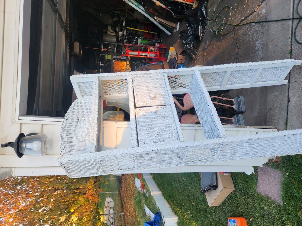 Material: It is made of woven wicker or rattan, painted white. Design: The unit features open shelving, side panels with a lattice design, a braided or rope-like trim along the edges, and a central cabinet with two doors and small knobs. Function: Due to its open bottom and tall, narrow design, it is likely intended as an over-the-toilet storage unit or a general freestanding etagere (a piece of furniture with open shelves).