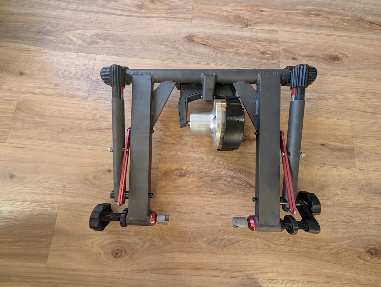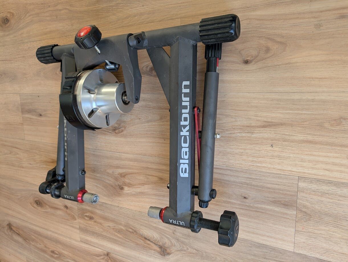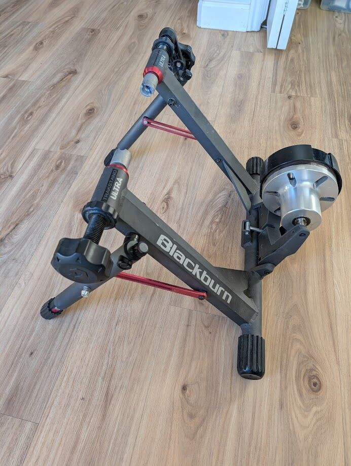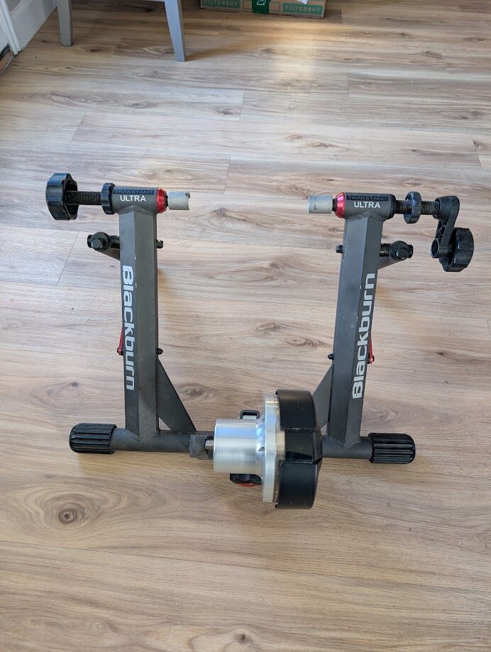 VenmoHere is a Blackburn magnetic trainer. Has adjustable legs to fit most road and mountain bikes. Easy to set up and folds flat to store. It’s easy to adjust the roller’s pressure on the rear tire using a large knob. A properly inflated tire doesn’t squeak or slip on the roller. It’s not necessary to crank the roller down too hard to avoid slippage. However, a tire ridden on the road may have collected grime and grit that impairs its traction. Clean the tire and roller before use with soap and water or rubbing alcohol. The Ultra’s frame is quite stable. I sprinted out of the saddle without disquieting rocking or creaking. It’s also one of the quietest trainers I’ve ever used. $300 when new $50 Cash or Venmo