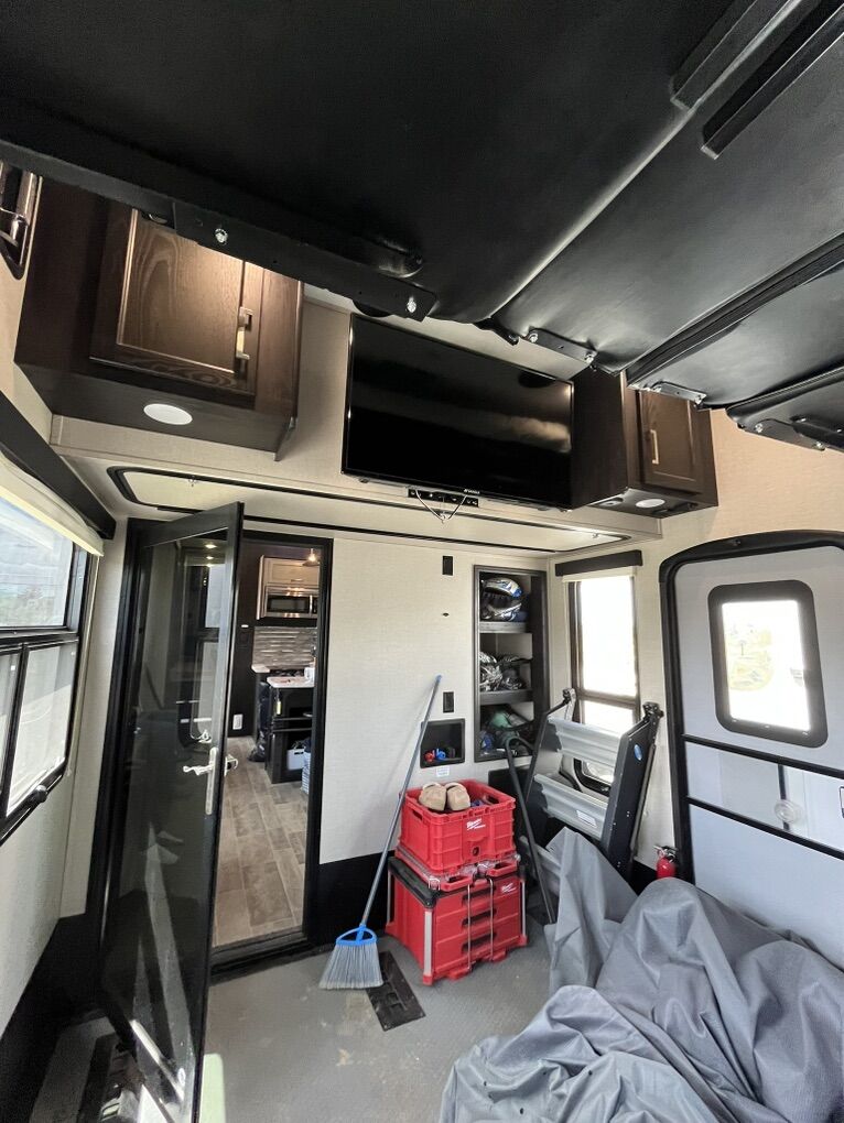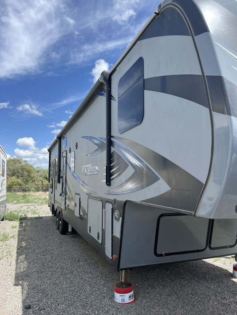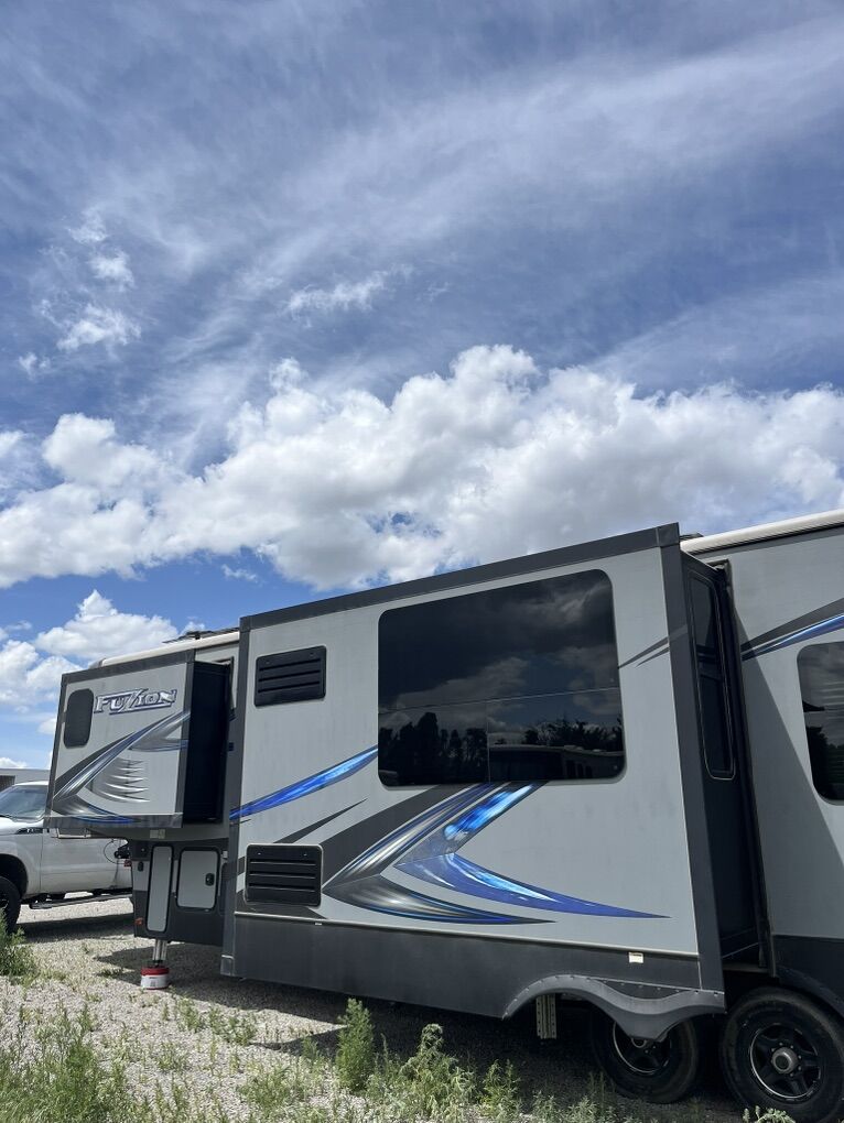 2018 Fuzion toyhauler. Garage is 10ft long. 2 slide outs. One in the bedroom where the closets slides out, the other is in the living room with the couch and fridge. The fridge is a residential fridge. TV in the main living room is 55”. Has a 18” tv in the bedroom and garage. Has an electric fireplace. Has a queen size ghost bed mattress. Two power beds in the garage. Three awnings. Two on the side covering the doors, one on the back over the garage. Garage door can be turned into a deck with the screen sides. Has a bed above the tv in the main living room. Storage for the ladder in the garage. 11ft garage. $55,000 OBO