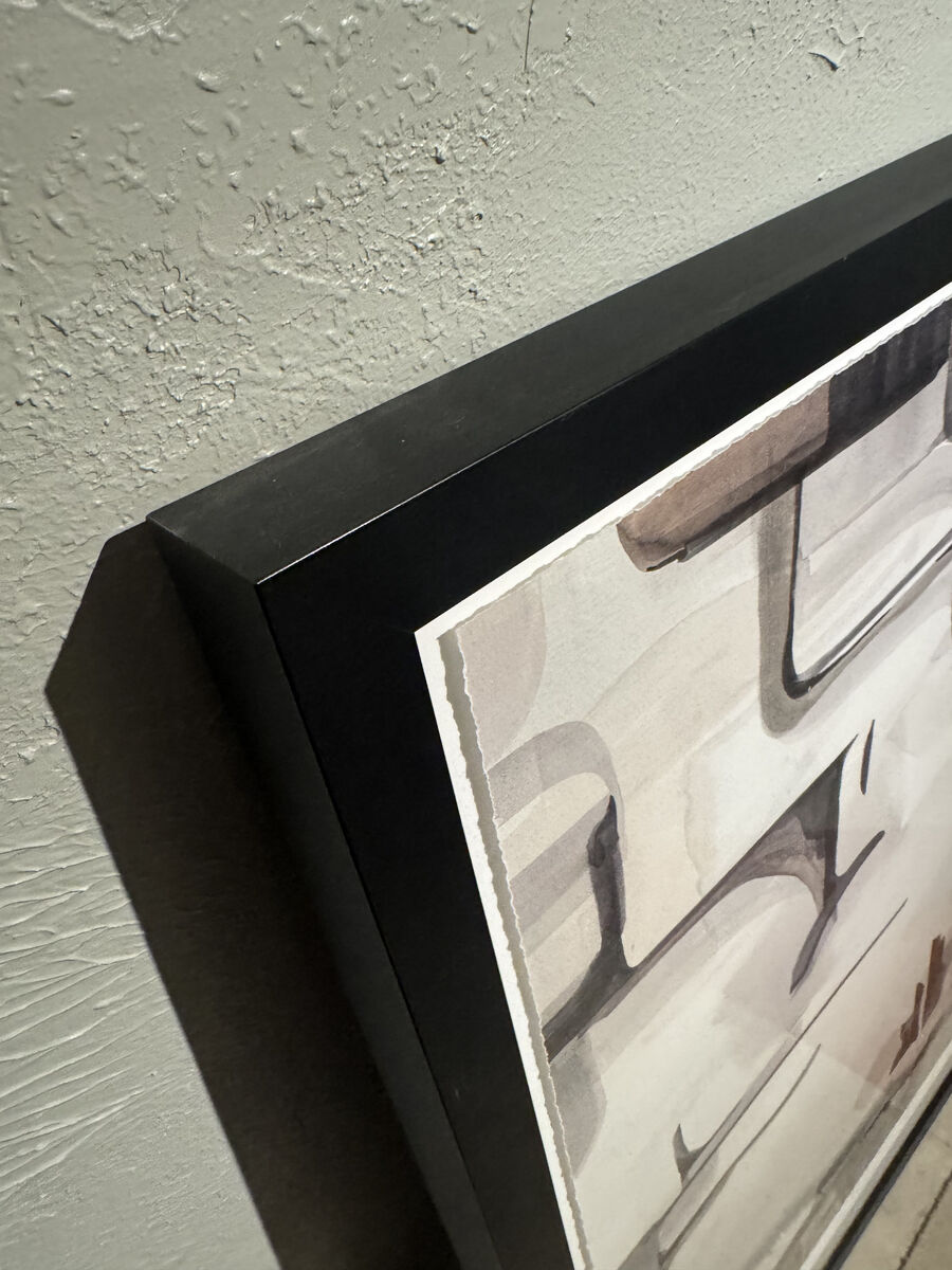 It's really eye catching and great addition. Square format, large frame. By Beverly Fuller from Crate & Barrel. The frame & mounting are high end.