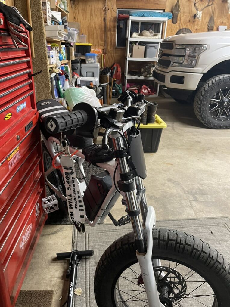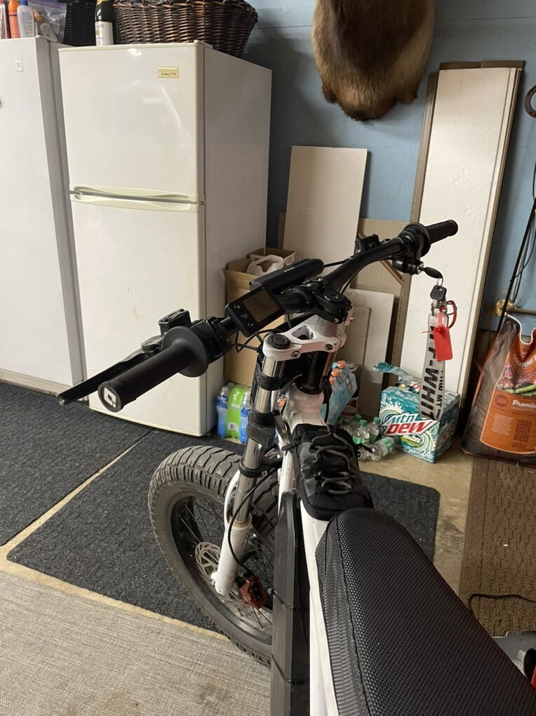 Great bike just looking to get an e-moto List off upgrades Odi grips Odi plate Upgraded controller Upgraded display Headlight Full twist throttle Guts seat cover Painted frame New bars Spacers Upgraded pedals It will go about 35 mph with 30 miles of range the only trades I will accept is a surron