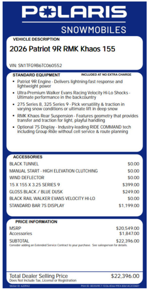 Build Info for VIN: SN1TFG9B6TC060552ComponentOption DescriptionTunnelBlack TunnelConvenience PackageManual Start - High Elevation ClutchingWindshieldWind DeflectorTrack15 x 155 x 3.25 Series 9ColorGloss Black / Blue DuskRail and ShocksBlack Rail, WALKER EVANS VELOCITY HI-LOHandlebar and DisplayStandard Bar, 7S Display New 2026 Polaris Patriot 9R RMK Khaos 155 Snowmobile For Sale In Salt Lake City, UT This New 2026 Polaris Patriot 9R RMK Khaos 155 Snowmobile is for sale at Karl Malone Powersports SLC conveniently located in Salt Lake City, Utah. Our knowledgeable team is eager to assist you, so don’t hesitate to contact us Snowmobile you're looking for don't hesitate to go back and revise your search. We're sure to have the perfect Snowmobile for you in our showroom in Utah. We invite you to visit us at Utah’s premier Polaris dealer for new and pre-owned Snowmobiles for sale. Let us help you find the ideal Snowmobile to take home today! Karl Malone Powersports SLC Address: 1379 W 3300 S, Salt Lake City, UT 84119 Phone: (801) 972-8725 2026 Polaris Patriot 9R RMK Khaos 155 The Ultimate in Dynamic and Agile All-Mountain Performance The RMK Khaos delivers transfer and traction for a wild and playful ride in the backcountry. RMK Khaos models are lighter than the competition for easier maneuverability and better flotation in deep snow conditions. Features may include: Quicker Response. Higher Track Speeds. QuickDrive is the lightest drive system in the industry and produces the lowest inertia for optimum response. Build Info for VIN: SN1TFG9B6TC060552 Component Option Description Tunnel Black Tunnel Convenience Package Manual Start - High Elevation Clutching Windshield Wind Deflector Track 15 x 155 x 3.25 Series 9 Color Gloss Black / Blue Dusk Rail and Shocks Black Rail, WALKER EVANS VELOCITY HI-LO Handlebar and Display Standard Bar, 7S Display