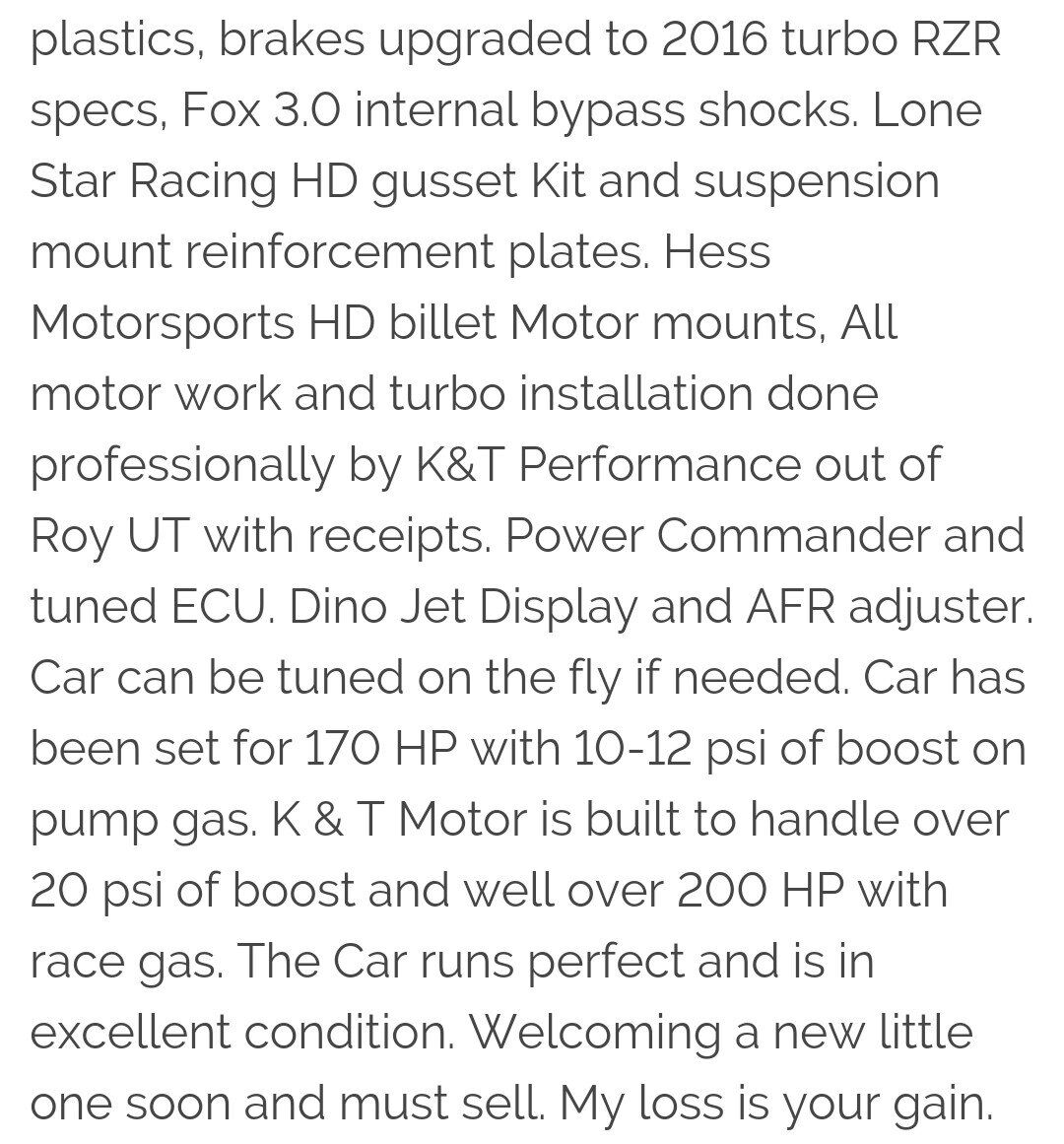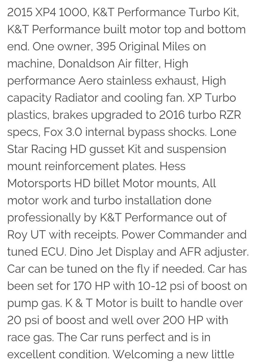 2015 Polaris RZR 1000 has a 2016 body less than 1600 miles on it vent racing roll cage and light bar and interior light be safe fire suppression system Warren winch k&T turbo built motor too much to list over 45k invested asking $20k with trailer and all spare parts looking for a Jeep or will consider other trades