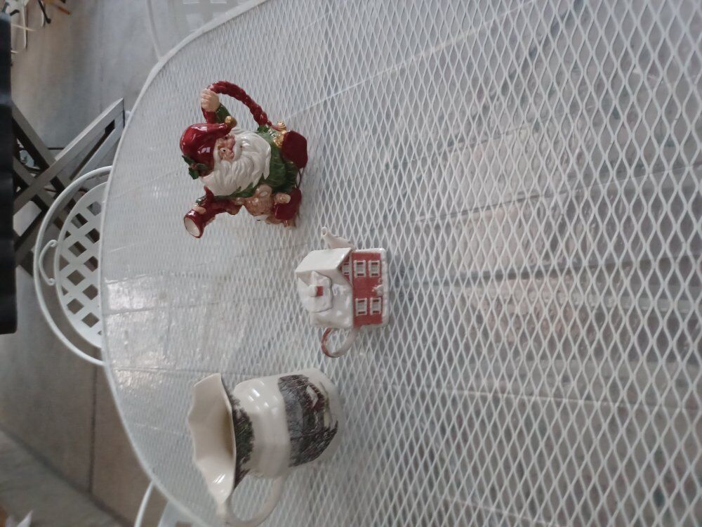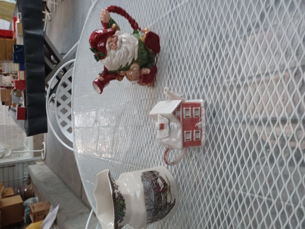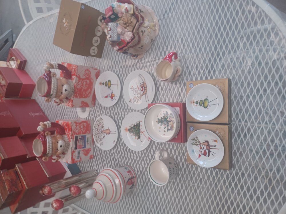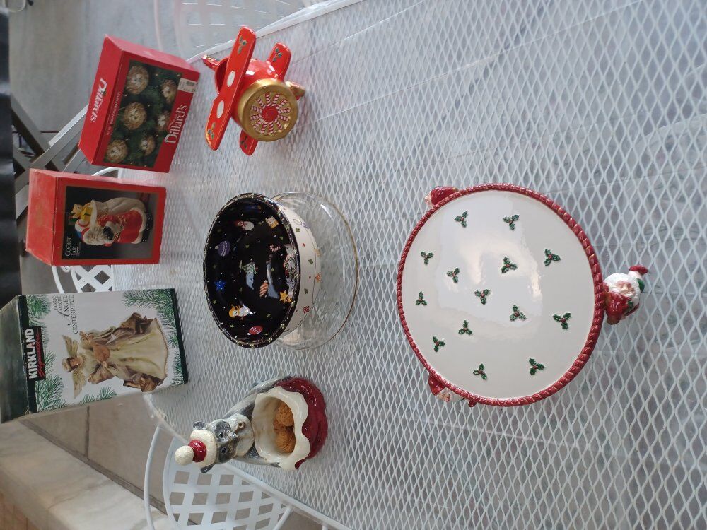 8 Xmas items are up. Angel table centerpiece, Santa cookie jar, Bird nests, {10} ornaments, Airplane cookie jar, Xmas bowel with Gold rimmed glass base, Racoon figure with nuts, and a Xmas cake stand. Make an offer and any reasonable offer will be considered. Thanks for checking my listing and have a great day !!!!!!!