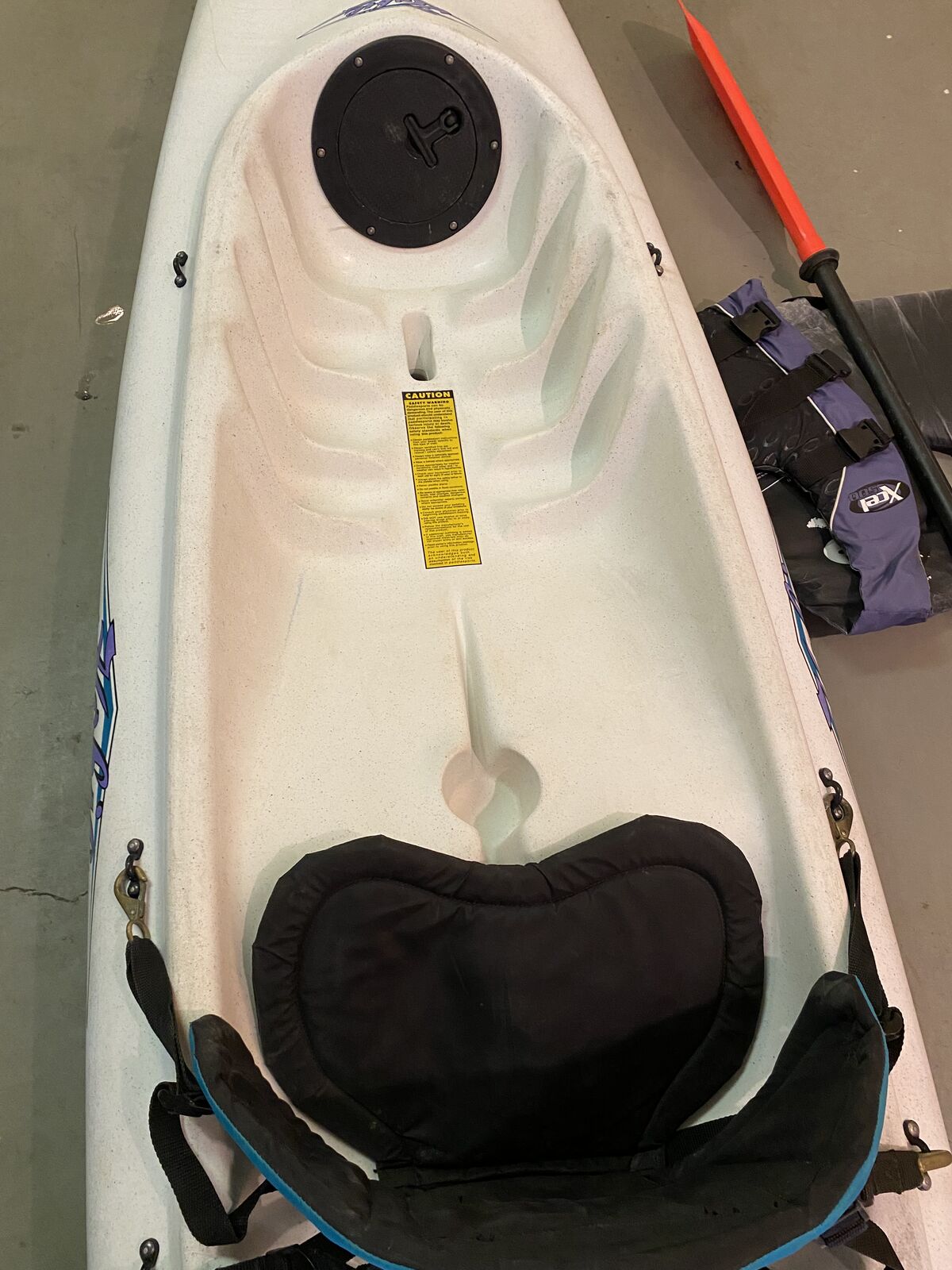 Sit-on-top 12 feet long and 30 inches wide. Paddle and life vest included. This kayak is fast in the water and a lot of fun. There is a storage area in the rear