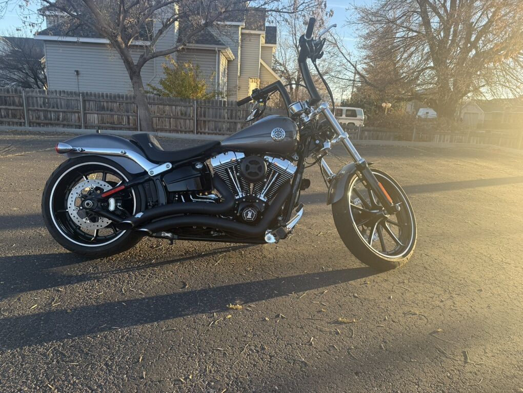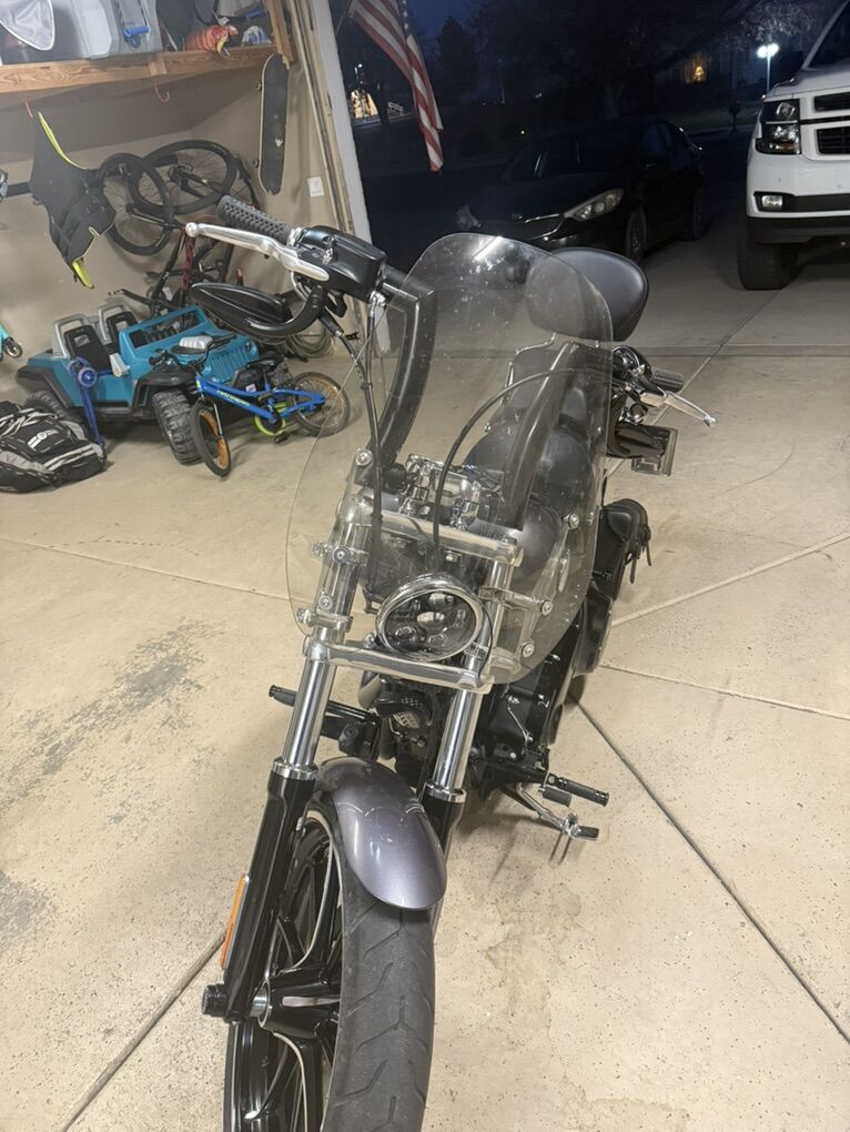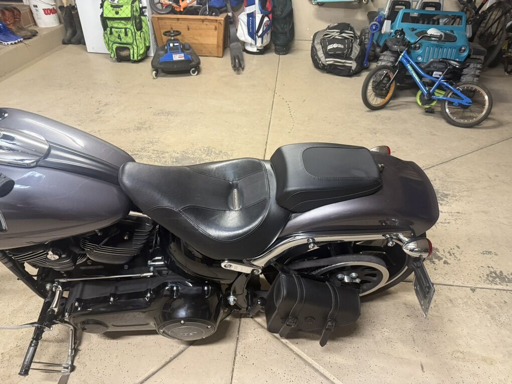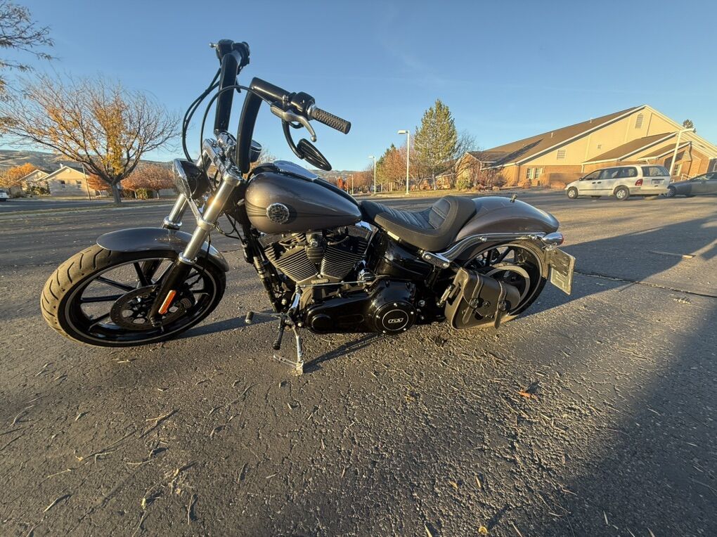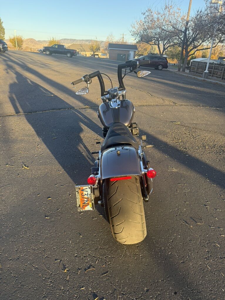 2015 Harley Davidson Breakout FXSB. Harley Davidson’s badest chopper style bike ever built with factory 240 fat rear tire and 45 degree rake. Immaculate condition, low miles, with lots of custom add-ons. Just under 7500 miles. Huge 2” Burley Bars with custom low profile led bullet turn signals. Vance & Hines Big Radius custom exhaust, Vance & Hines VO2 X custom big air intake, all blacked out covers and accessories, Kodlin striped low profile solo seat, leather swing arm saddle bag. Has factory seat with passenger low profile seat as well. Also has passenger pillion with back rest and clamp-on windshield for cruising. This bike turns heads everywhere I go and runs and sounds even better! Text with any questions. Thank you!