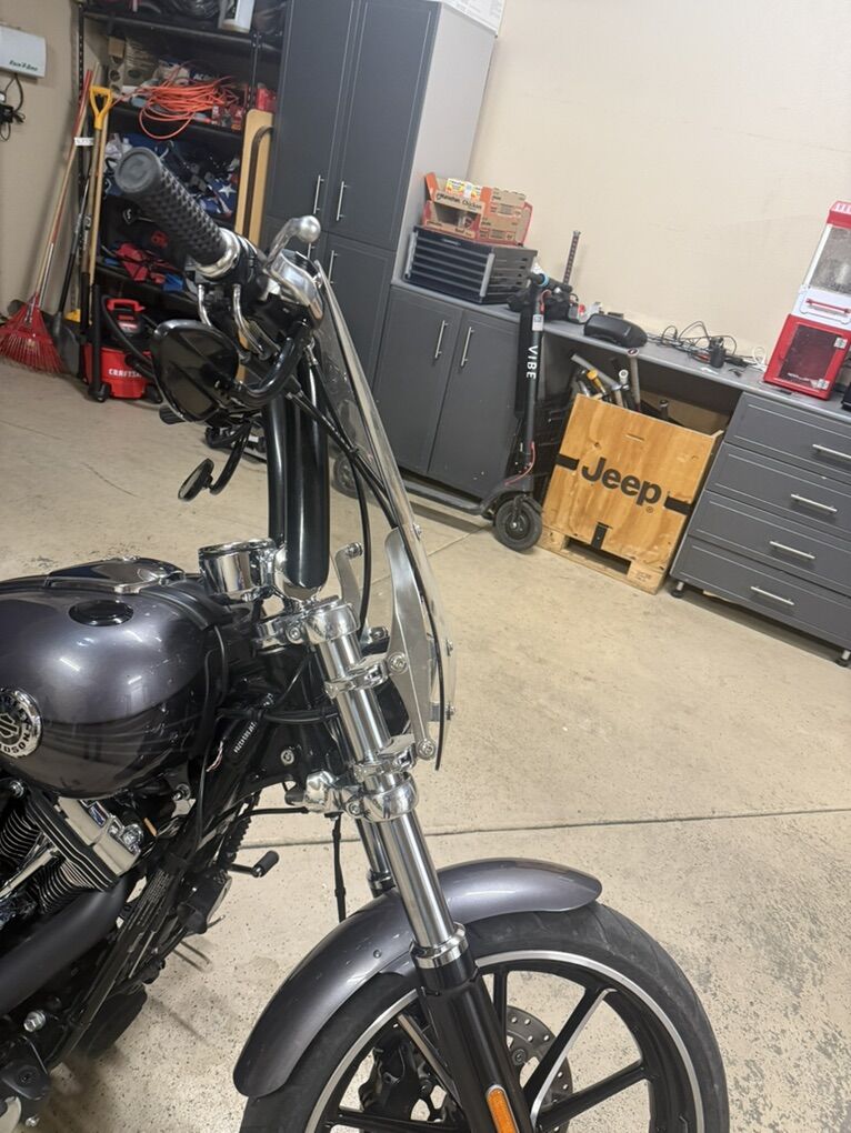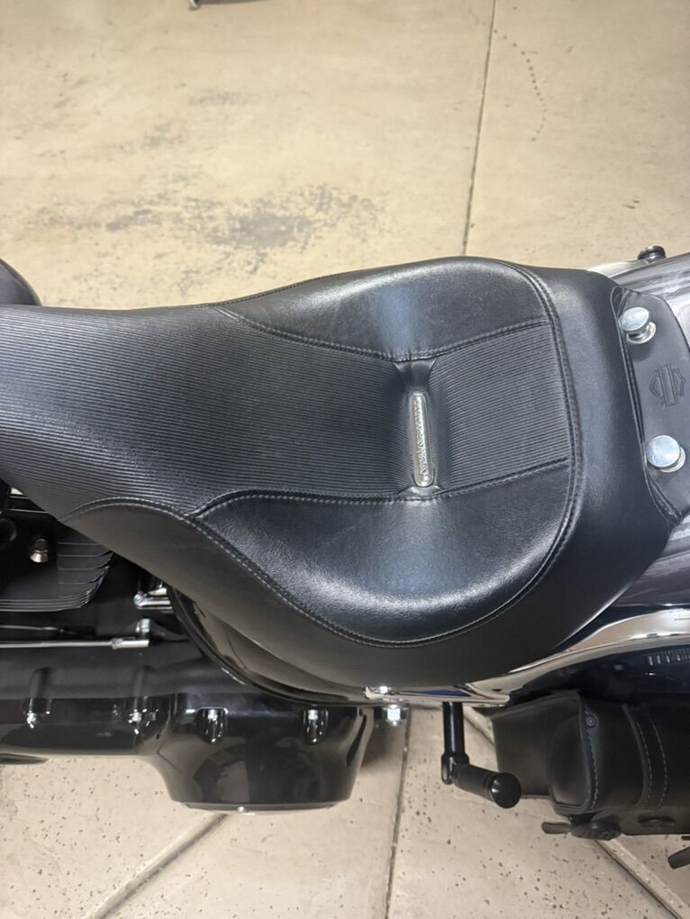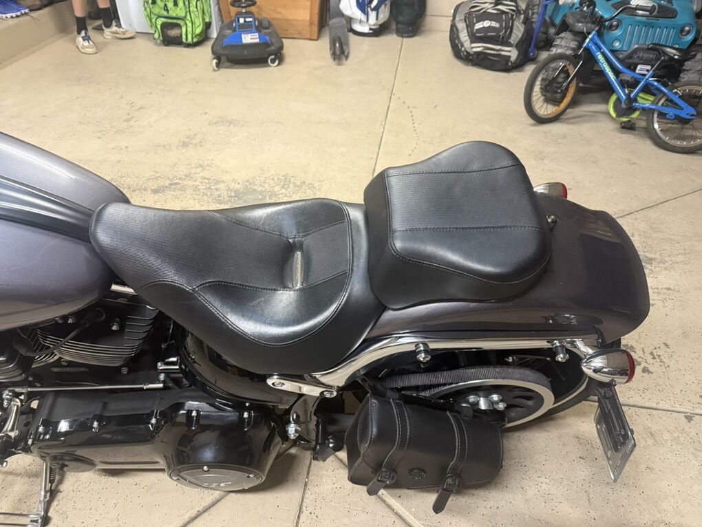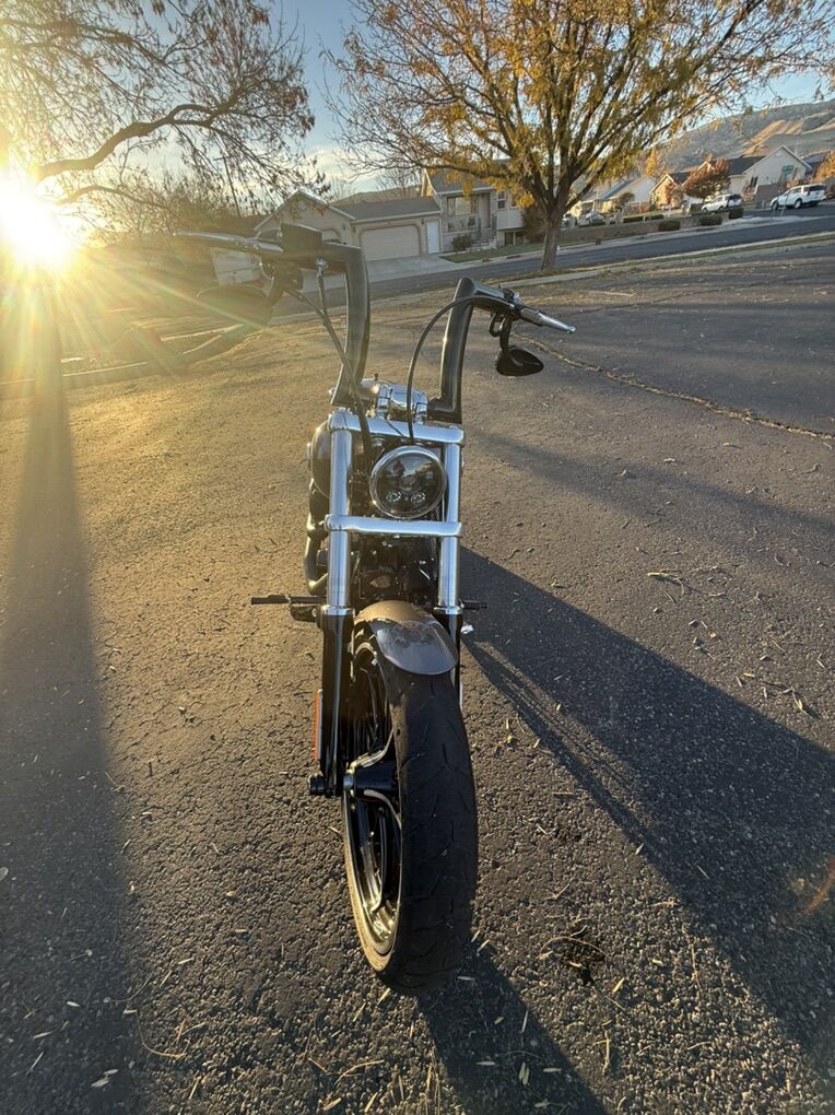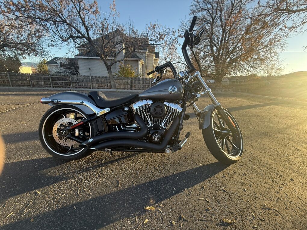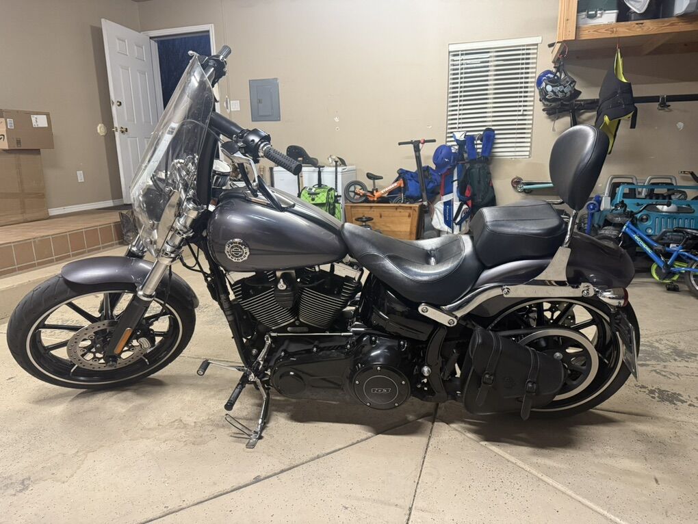 2015 Harley Davidson Breakout FXSB. Harley Davidson’s badest chopper style bike ever built with factory 240 fat rear tire and 45 degree rake. Immaculate condition, low miles, with lots of custom add-ons. Just under 7500 miles. Huge 2” Burley Bars with custom low profile led bullet turn signals. Vance & Hines Big Radius custom exhaust, Vance & Hines VO2 X custom big air intake, all blacked out covers and accessories, Kodlin striped low profile solo seat, leather swing arm saddle bag. Has factory seat with passenger low profile seat as well. Also has passenger pillion with back rest and clamp-on windshield for cruising. This bike turns heads everywhere I go and runs and sounds even better! Text with any questions. Thank you!