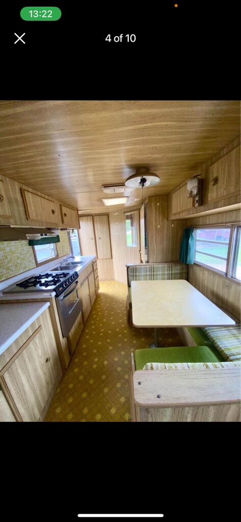 1974 nomad camper. Everything works other than a few light bulbs. Even has a radio in it. Brand new tires with maybe 50 miles on them. Could sleep 6 depending how close you want to be with someone. Had a bed in the front, kitchen table turns to a bed, and a bed aho high in the front. So I’d say 5 comfortably. Had a small leak above the the door but it has been stopped. Just had it out this weekend and it was great. Open to offers and trades.