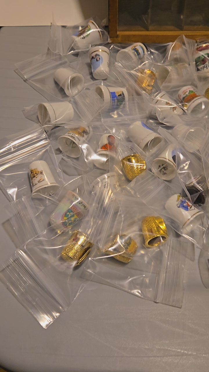 84 different thimbles and Display case that holds 100 thimbles.