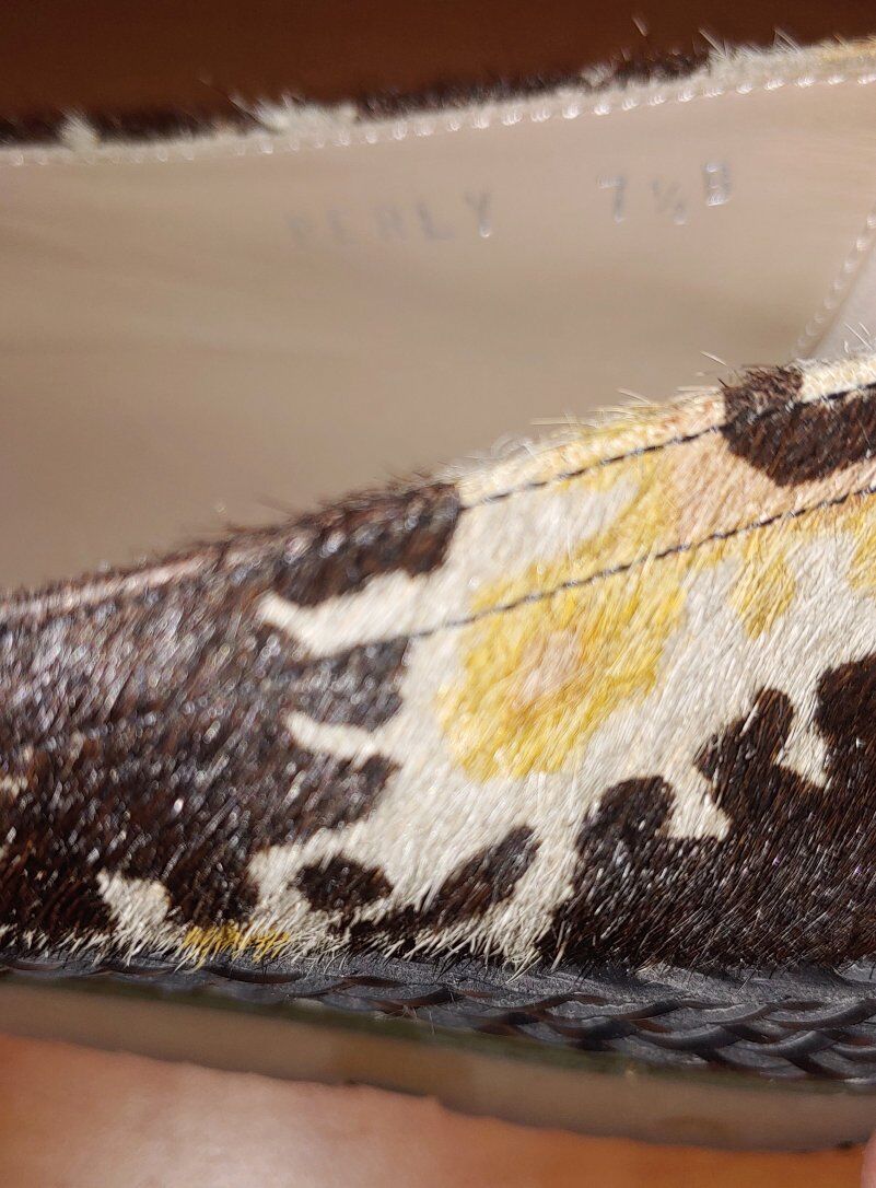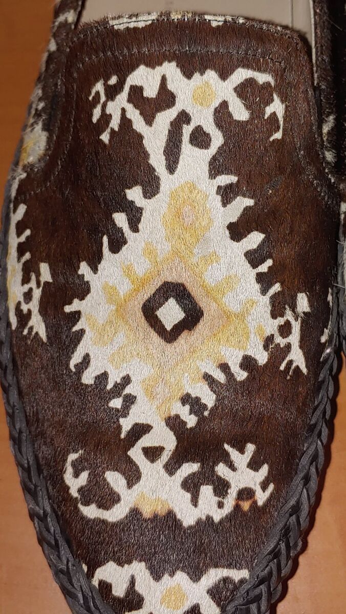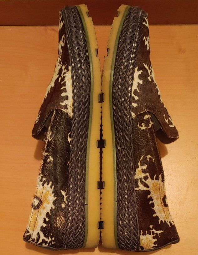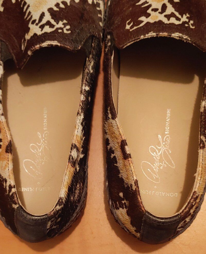 Designer Donald Pliner + Lisa Signature slip-on loafer style shoes made in Italy. Crafted with a dark espresso brown calf hair and tapestry/ikat design that is created with colors from each strand. A unique style and design with many details.