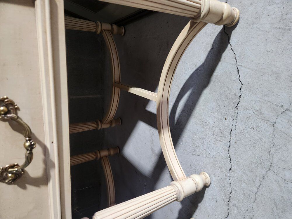 vintage or antique round glass-top coffee table. Manufacturer: Hammary The table features a carved wood frame with a light, off-white or cream, painted finish and cabriole-style legs