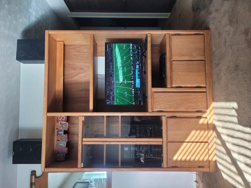 Zelle70" tall x 59" wide x16 1/2" deep, solid wood (oak) entertainment center, the shelf above the television is adjustable. Stereo with 5 disc capacity and speakers also for sale seperately for $85. Will sell all as a package for $218 includes entertainment center, stereo and speakers. The entertainment center price is $168 Please text Bob at 801-644-6639 or message through KSL Classified.