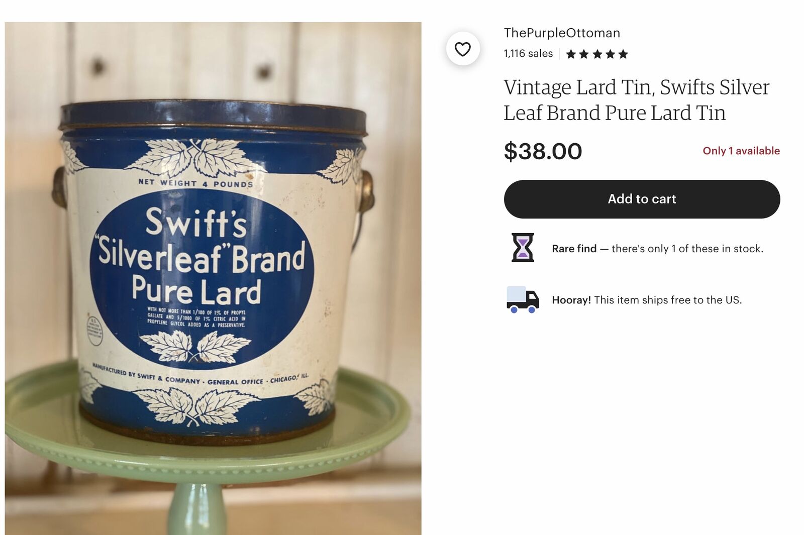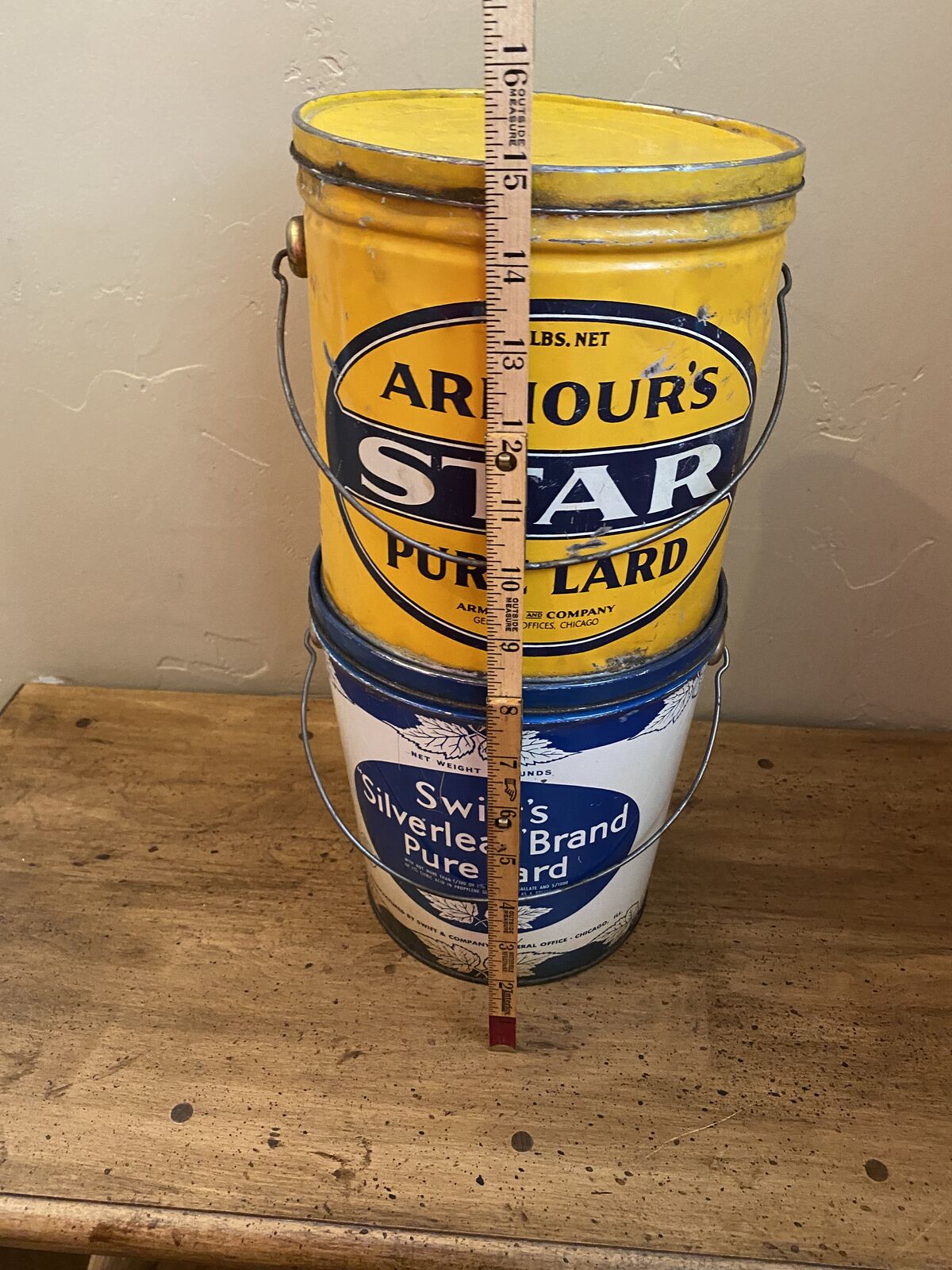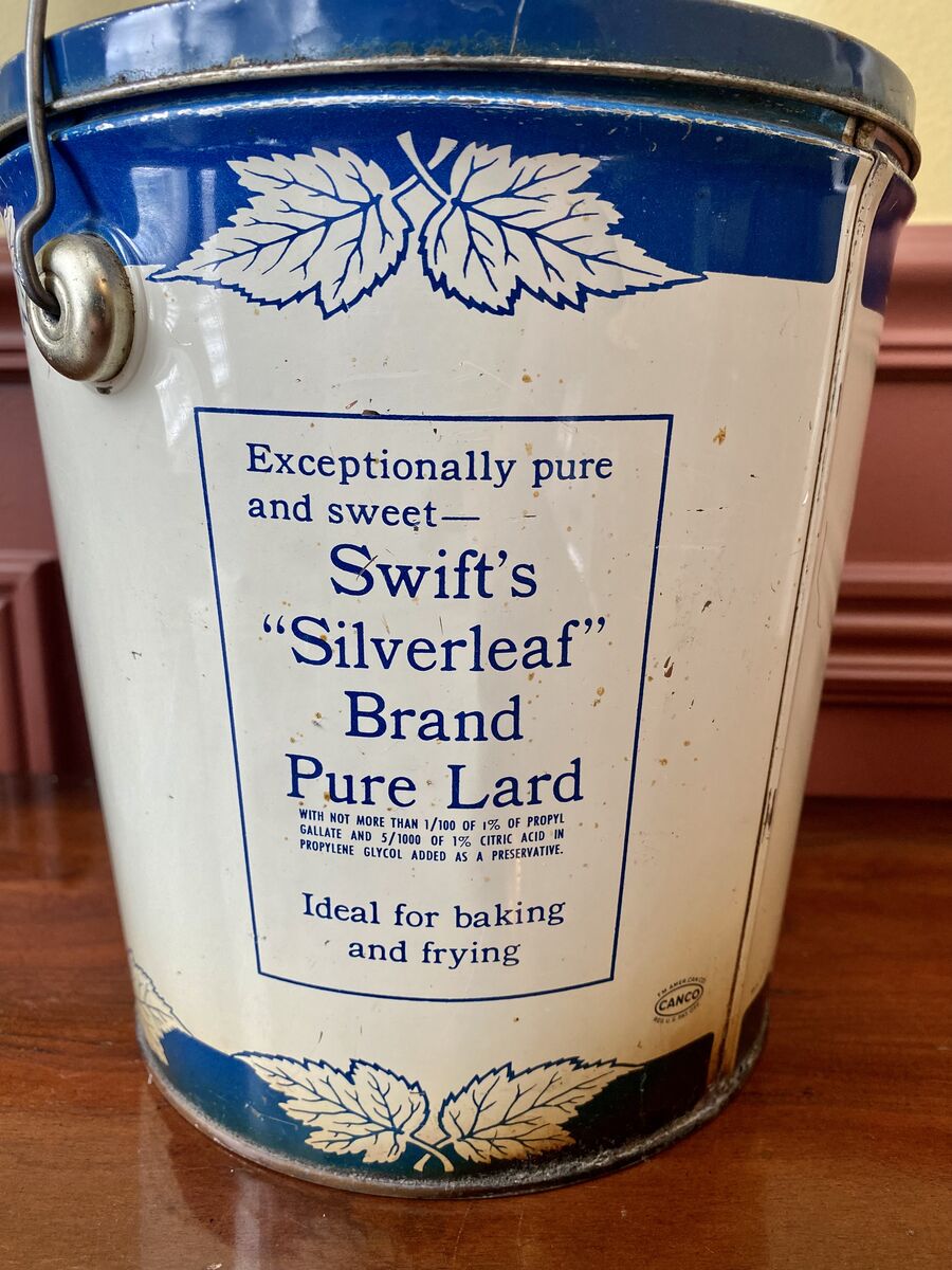 RARE- Swifts Silverleaf Brand Pure Lard - Vintage Advertising Large Tin Bucket in Blue N White - C PIX. These are awesome in Decorating! Quite the conversation starter. I believe that's it's from the 1920s. I also have the yellow and blue one in a separate listing.
