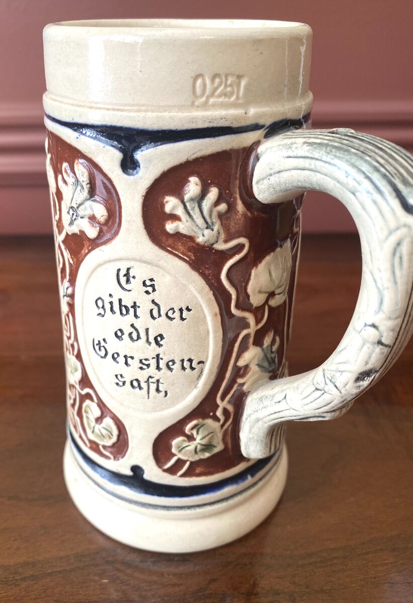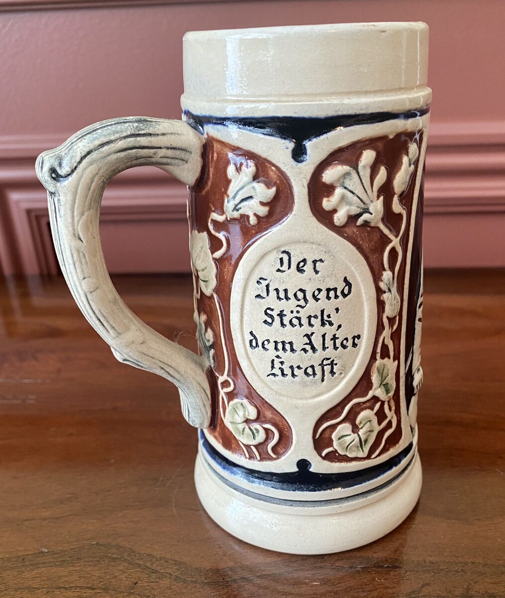 RARE Vintage German Stein With Interesting Markings Please See Photos For Details. I have no idea what the German Writtings mean. If you do, please let me know. Translation: "The noble wheat juice provides the youth with strength and the old with power."
