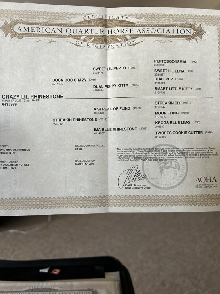 Here is a chance to own a beautiful grey filly that’s going to grow up into one heck of a horse! Her mother is an own daughter of Streak Of Fling and has run barrels in her younger days! Paddy is gentle and smart with a great disposition! Tons of talent! Athletic and will make a great break away horse! Head horse! Or whatever you want to use her at! Her Dad Chisum is 5-panel n/n tested and stands 15 hands. Boon Doc Crazy is a proven money-earner out of industry legendsPeptoboonsmal (https://www.allbreedpedigree.com/peptoboonsmal)$180K LTE (money earning progeny in excess of $28M),Smart Little Lena (https://www.allbreedpedigree.com/smart+little+lena)$743K LTE (money earning progeny in excess of $42M, and #2 All-Time Leading Sire) and Dual Pep $302K LTE (money earning progeny in excess of $25M and #5 All-Time Leading Sire). Boon Doc Crazy an own son of Sweet Lil Pepto who has amassed $237,783 LTE, he is an NCHA Top 20 Leading Sire. Dual Peppy Kitty has earned $1,788 LTE in NCHA and has progeny earnings of $232,058. She had a coming three-year-old by High Brow CD that sold for $200,000 at the NCHA Western Bloodstock Futurity Sale in December of 2018! Below is the show record for Boon Doc Crazy:\