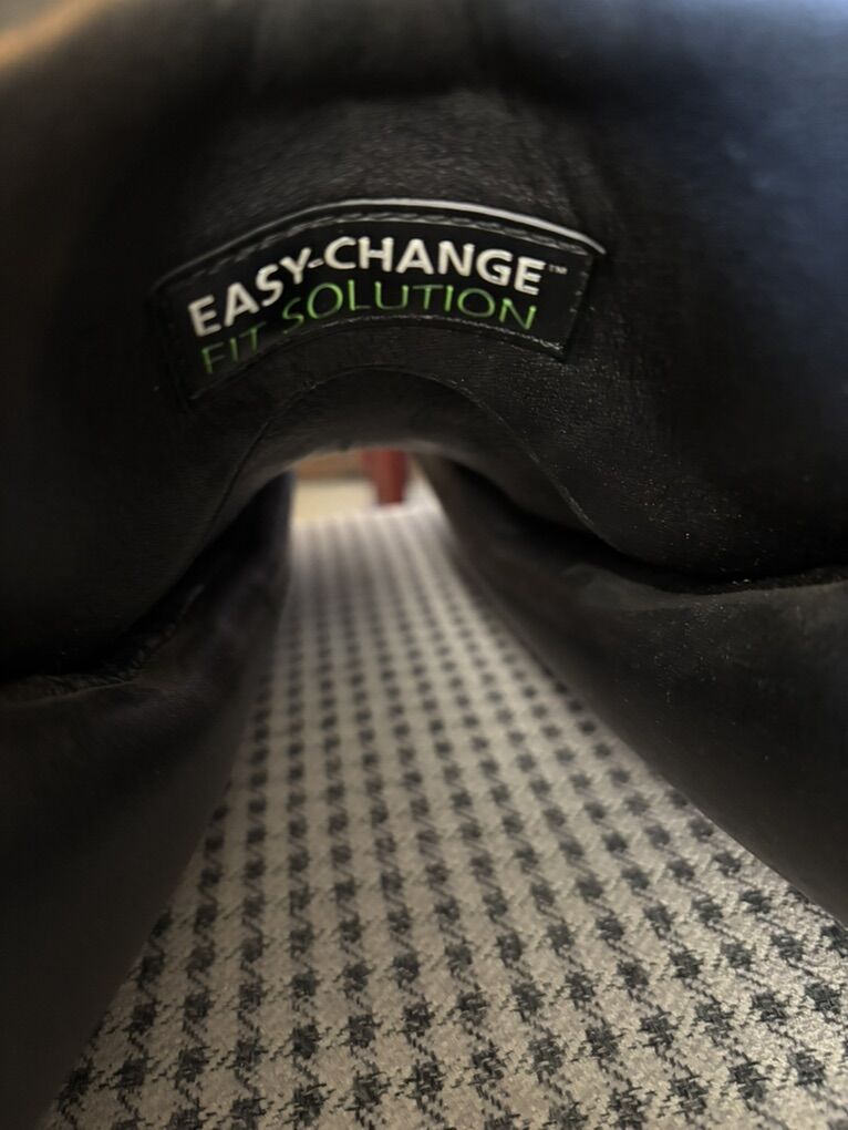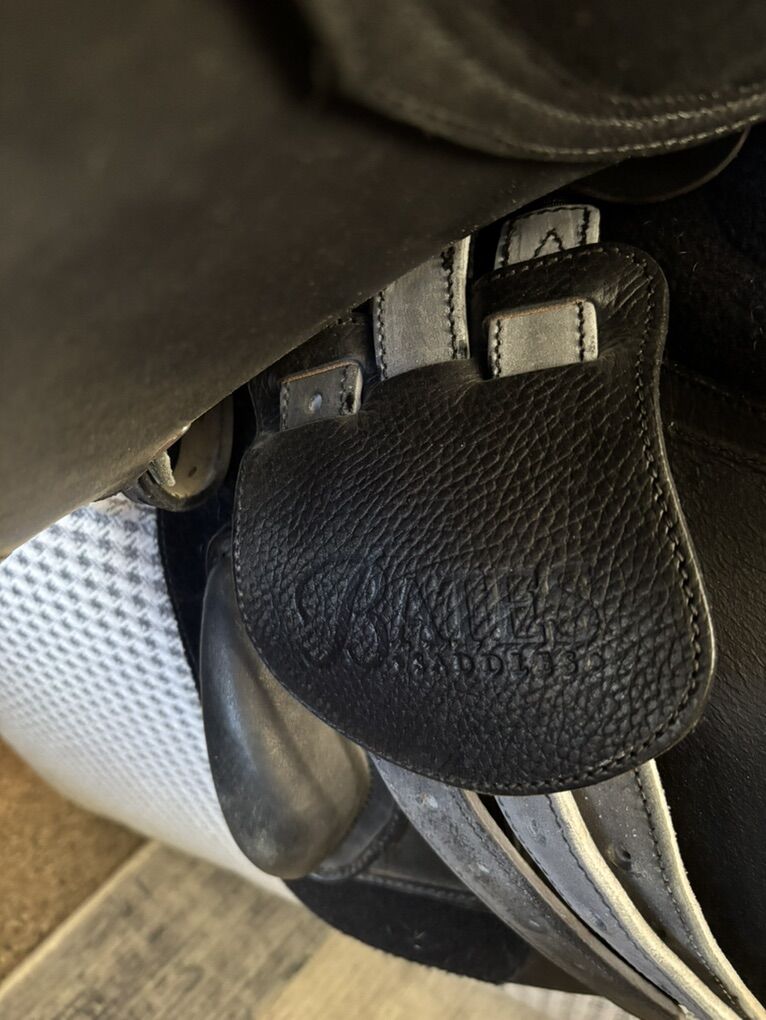Paramour monoflap black saddle designed for closer contact feel with horse. Deep seat, long stirrup leather and straight at flap that accommodates the riders long leg position. 40” side to side seat.