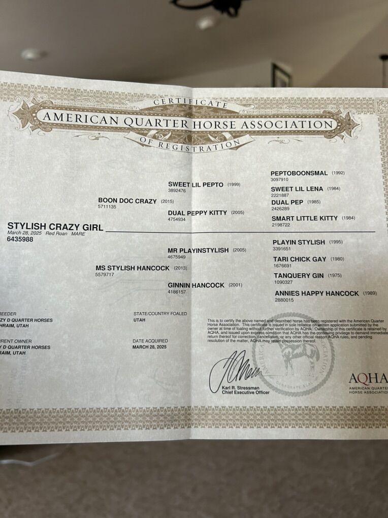 Stella, is going to be a beautiful dark red roan ! She is very talented! Athletic, great disposition comes from a long line of Champions! She can go in any direction you want to take her! Her Dad Boon Doc Crazy is a proven money-earner out of industry legendsPeptoboonsmal (https://www.allbreedpedigree.com/peptoboonsmal)$180K LTE (money earning progeny in excess of $28M),Smart Little Lena (https://www.allbreedpedigree.com/smart+little+lena)$743K LTE (money earning progeny in excess of $42M, and #2 All-Time Leading Sire) and Dual Pep $302K LTE (money earning progeny in excess of $25M and #5 All-Time Leading Sire). Boon Doc Crazy an own son of Sweet Lil Pepto who has amassed $237,783 LTE, he is an NCHA Top 20 Leading Sire. Dual Peppy Kitty has earned $1,788 LTE in NCHA and has progeny earnings of $232,058. She had a coming three-year-old by High Brow CD that sold for $200,000 at the NCHA Western Bloodstock Futurity Sale in December of 2018! Below is the show record for Boon Doc Crazy:\
