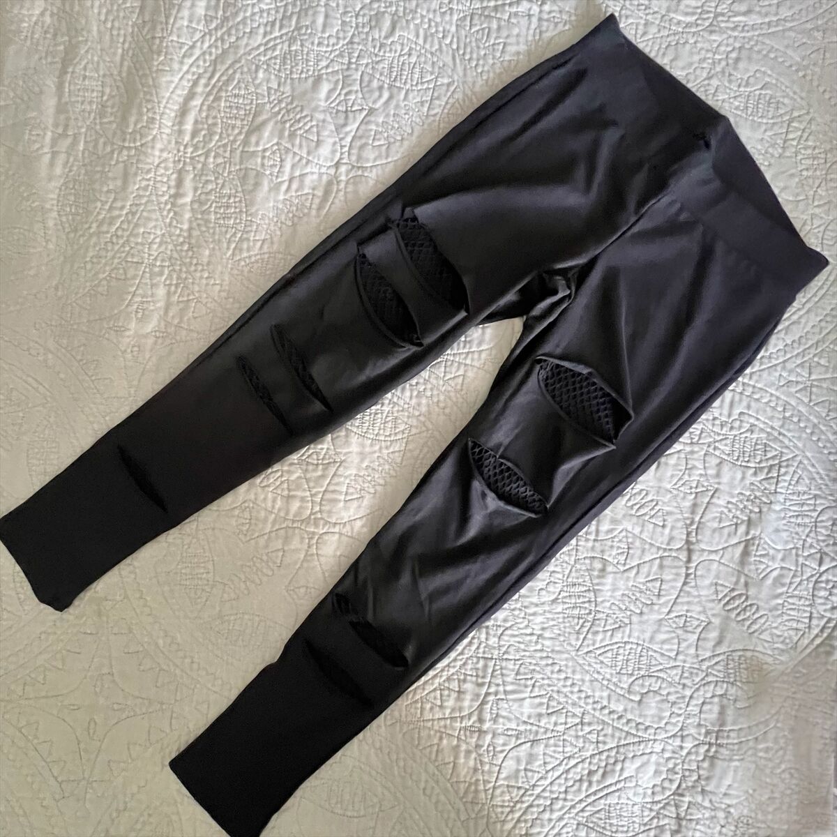 • High waist • Wide stretch waistband • Slashed tapered leg • Fishnet inserts • 28" inseam