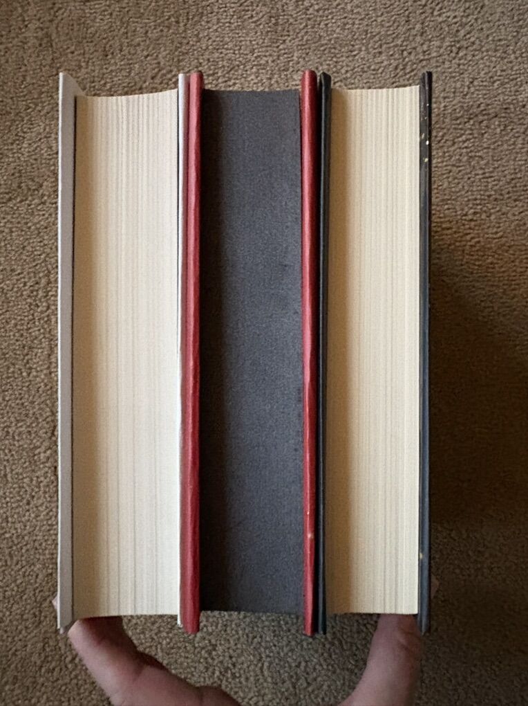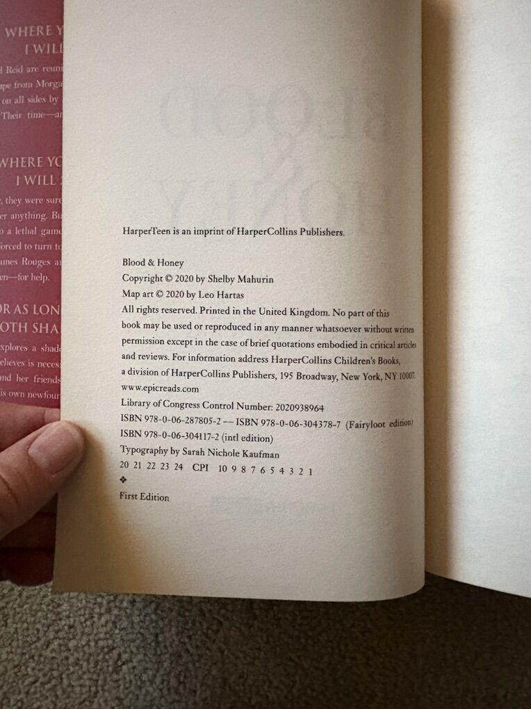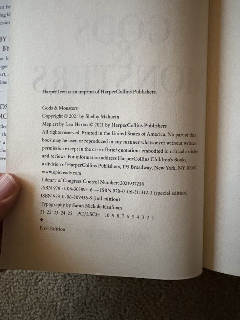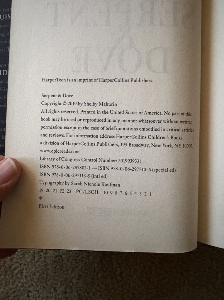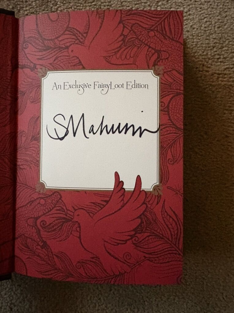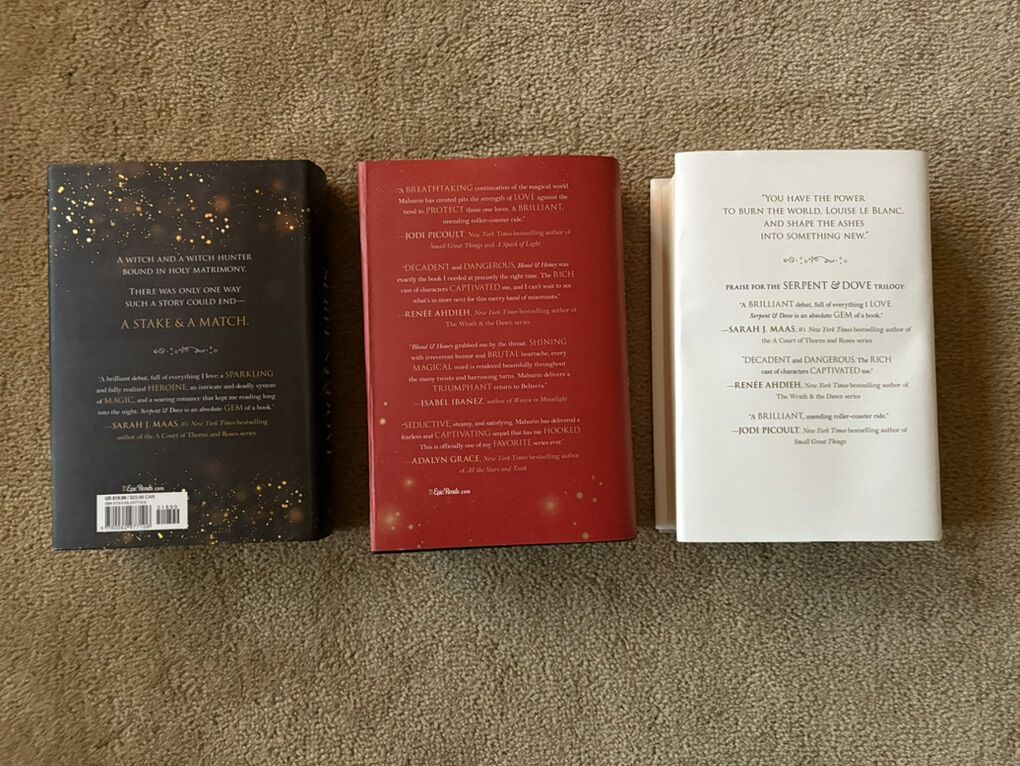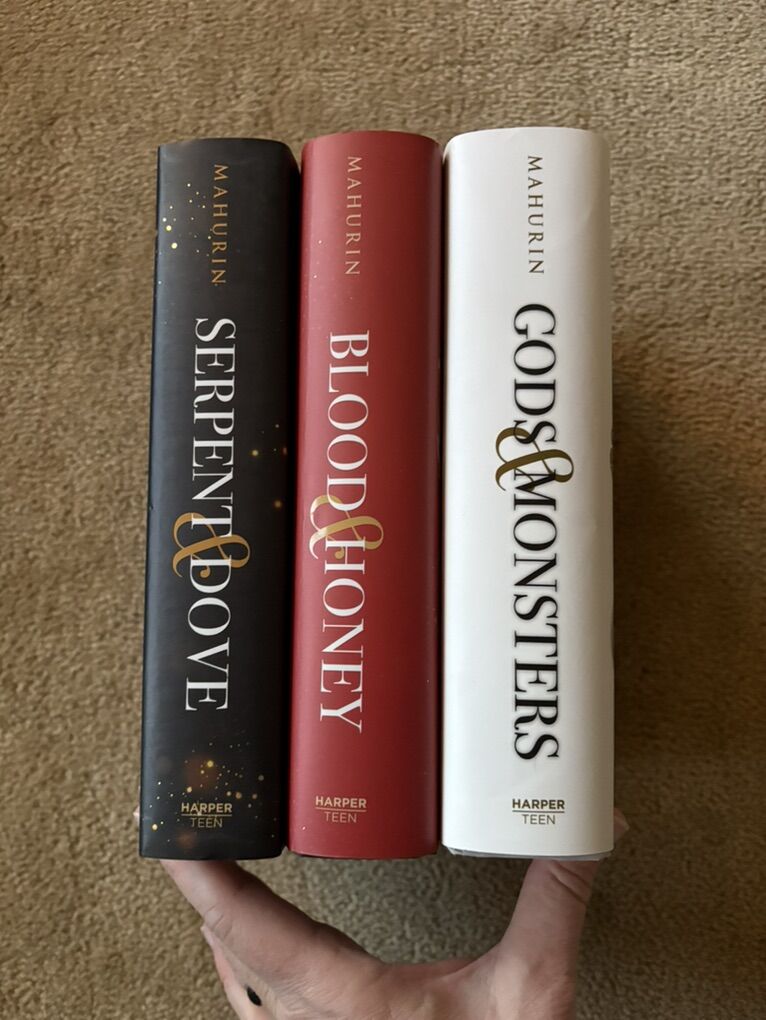 Complete Serpent & Dove trilogy by Shelby Mahurin: Serpent & Dove (2019, 519 pages--Barnes & Noble YA Book Club Edition with exclusive material, former owner's stamp on flyleaf); Blood & Honey (2020, 532 pages—exclusive FairyLoot edition, with exclusive art on inside of dust jacket, black sprayed edges, SIGNED by the author); and Gods & Monsters (2021, 612 pages—with exclusive art on inside of dust jacket, SIGNED by the author). First edition hardcovers. Inside of dust jackets 2 & 3 slightly worn from being displayed inside-out on books (see photos). Otherwise excellent condition. Text only. Cash or Venmo.