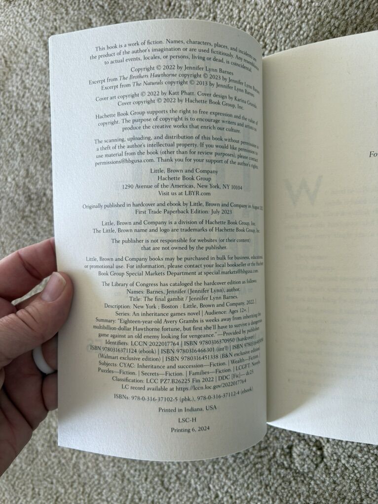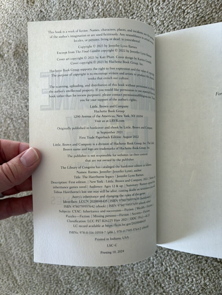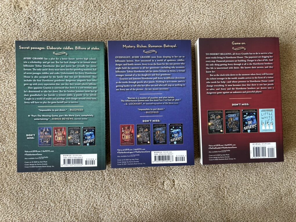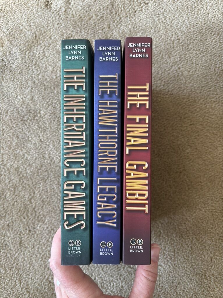 The Inheritance Games Series 1-3, by Jennifer Lynn Barnes: The Inheritance Games (2020, 374 pages), The Hawthorne Legacy (2021, 358 pages), and The Final Gambit (2022, 374 pages). Paperbacks in excellent, like new condition. Text only. Cash or Venmo. Discount on multiple items.
