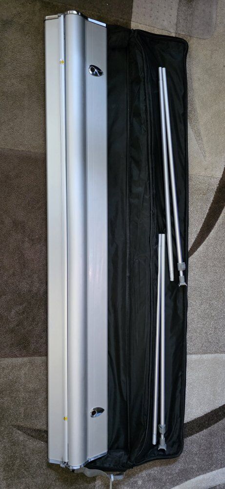 • 59" banner width • adjustable banner height: 60" - 83.25" • carry bag included • lightweight retractable pull up banner stand • hybrid bungee/telescopic pole