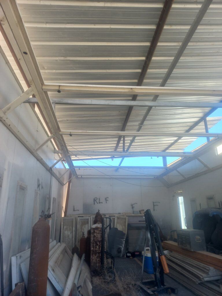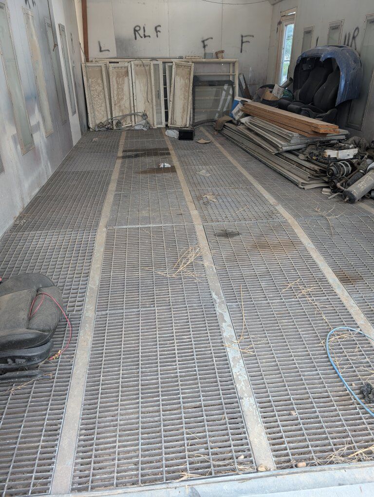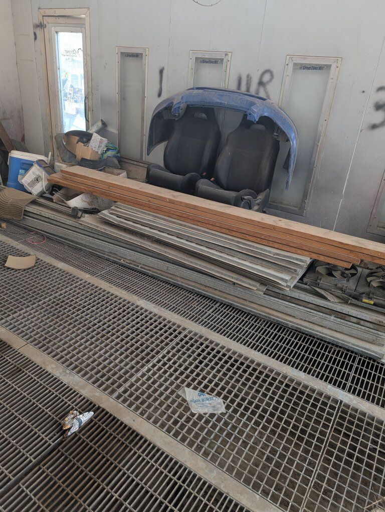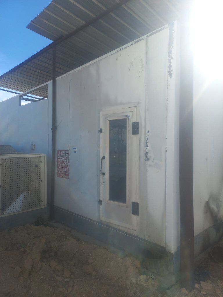 down draft paint booth will come with roof if u need it it's a 30 feet long 15 feet wide you can fit a long bed dully truck in it 4 door no problem I have everything to make it work the doors are inside left side the roof is on the right under wood the lights are at the back everything is there fans on outside one suction fan through the floor. the other one blows through the top. I have new vac coms for the speed of the fans. either 480 or 220 3-phase