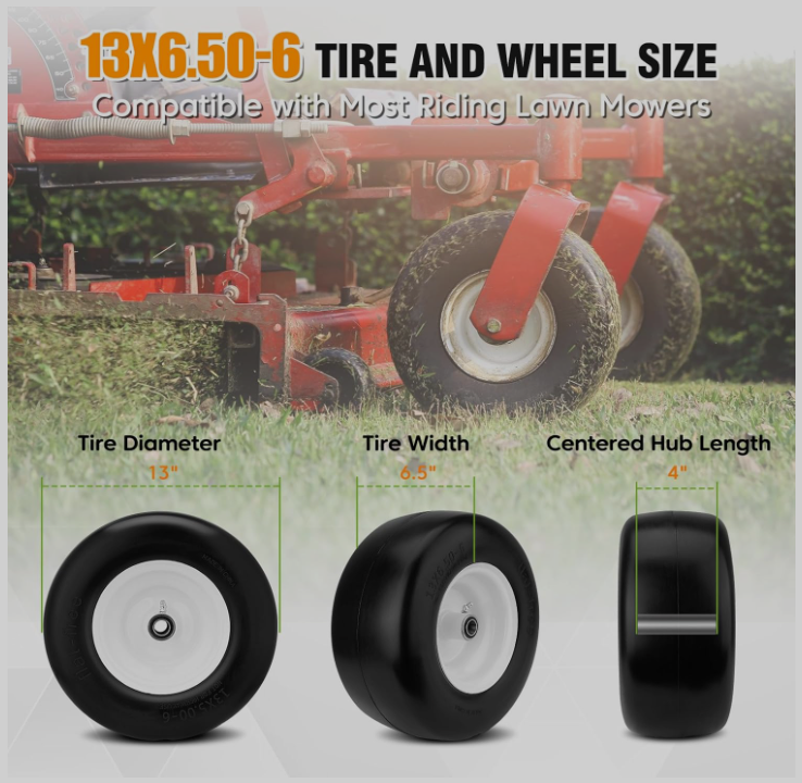 Compatible with most zero-turn mowers and riding lawn mowers including Cub Cadet, Toro, and others. Just measure your existing wheel hub length and axle size to confirm fitment before purchasing. These are NHS (Not for Highway Service) tires designed for lawn equipment only.