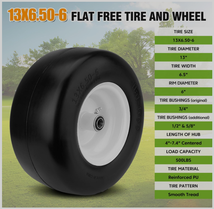 ApplePayBrand new 2-pack of 13x6.50-6 flat-free lawn mower tires and wheels in white. Never installed, never used.