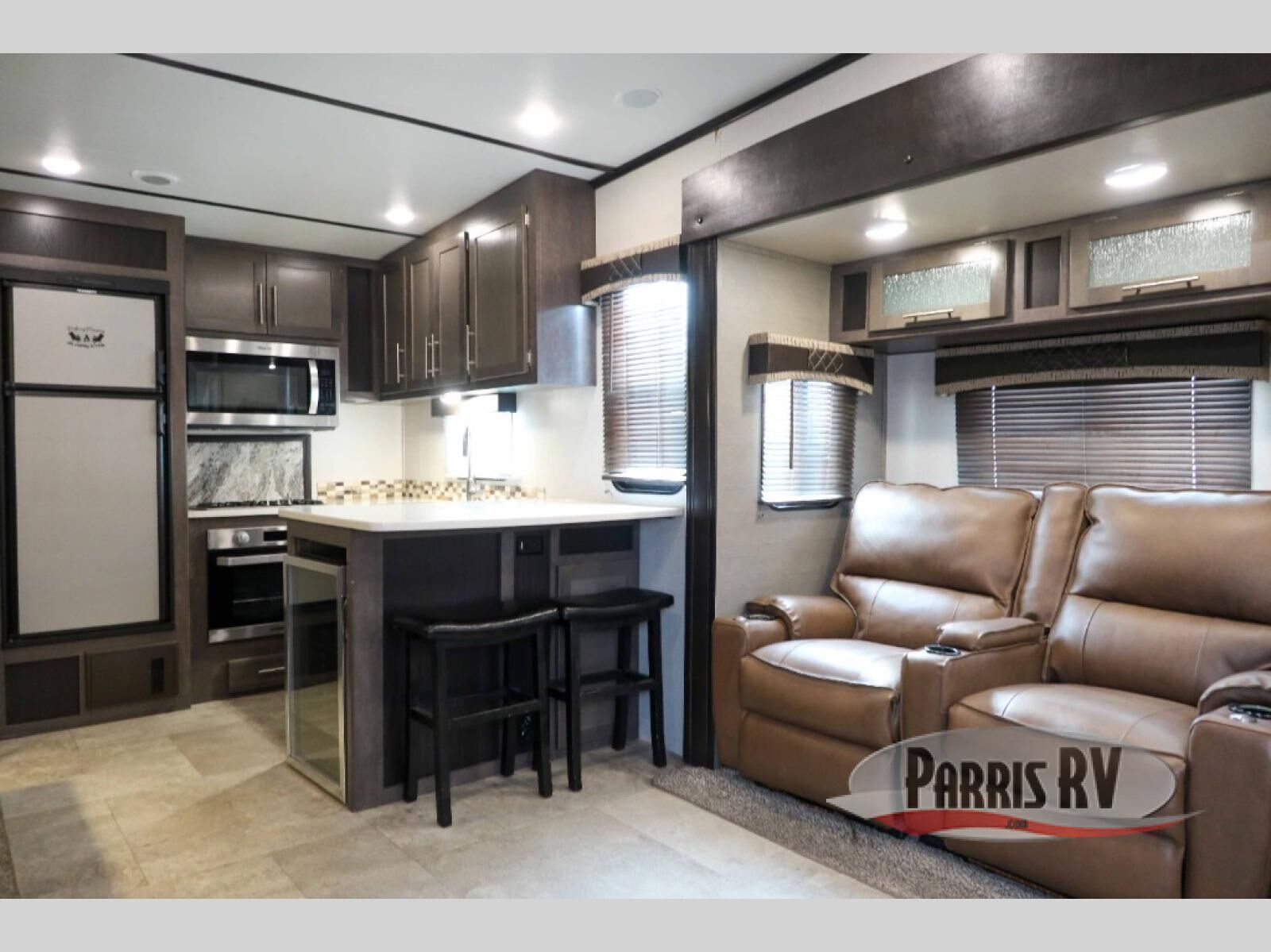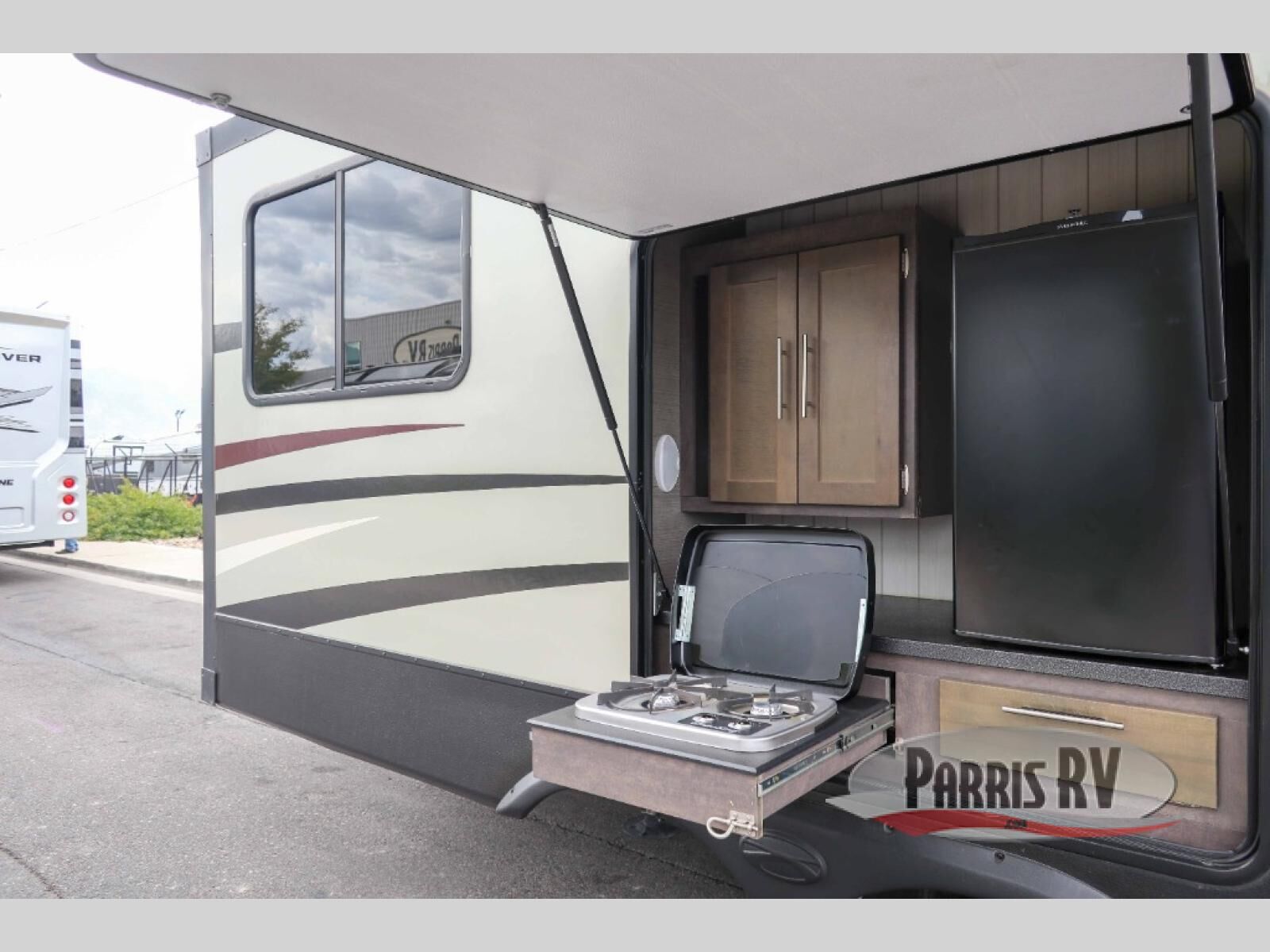 When it is time to relax and get away from the business of life, load up this triple slide out Cruiser Aire CR29RK fifth wheel and head out to your quiet retreat. The hardest decision that you will have to make is where you will fix your meals - inside or outside. At the exterior kitchen there is a two burner range and a pantry, plus a refrigerator where you can keep drinks cool. Inside this model you will find the rear kitchen where there is a spacious counter peninsula with two bar stools and a wine cooler. The living room has comfortable seating at the 64" sofa or the 64" theater seats, plus overhead cabinets with plenty of room to store your camping needs. You will enjoy a good night's rest on the queen bed inside the front private bedroom, which also has a spacious closet for you to be dressed for any occasion!