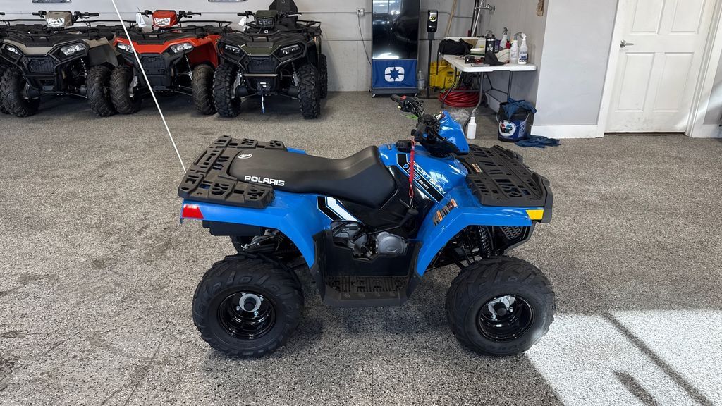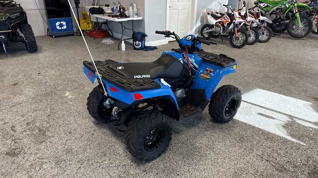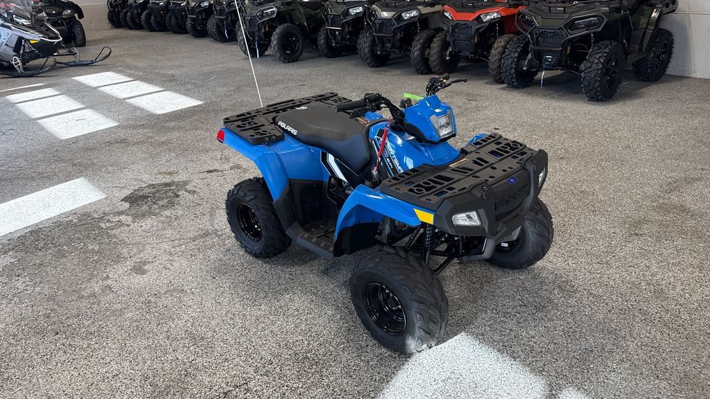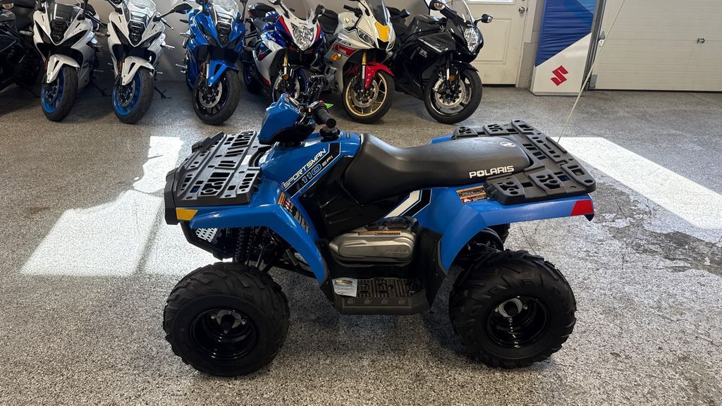 2025 Polaris® Sportsman 110 INSPIRING CONFIDENCE OFF ROAD. A youth ATV perfect for introducing young riders to trail riding. Engineered for safety, control and fun. Ages 10+ with adult supervision. Features may include: Control the Speed, Not the Fun Parents can adjust the machine's speed to fit their kid's skill level and comfort. LED Lighting Improved visibility, front and rear, to see and be seen. Stop with Confidence Built with reliable drum brakes for easy, efficient stopping. Includes handlebar-mounted parking brake. Smooth Starting Both kids and parents will love the improved cold starting reliability and consistent performance of electronic fuel injection (EFI). Comfortable Riding Ride in comfort with 5" of front and 6" of rear suspension travel. Take on the Trail Featuring 19" front tires, and 18" rear tires for traction, stability and handling.