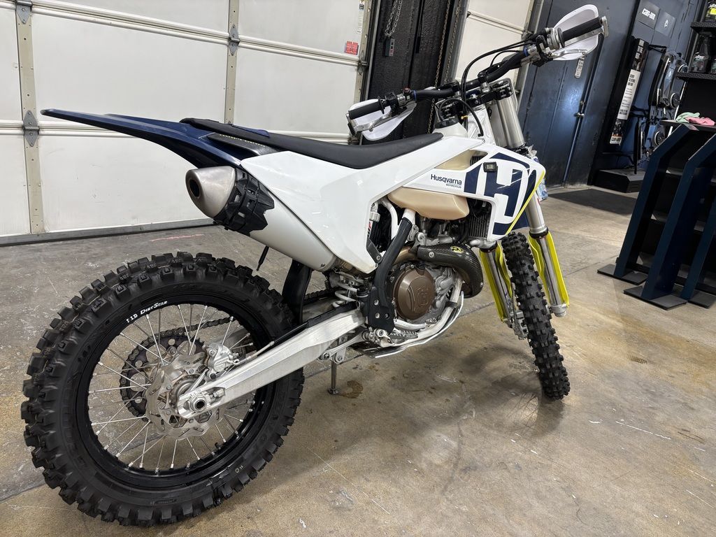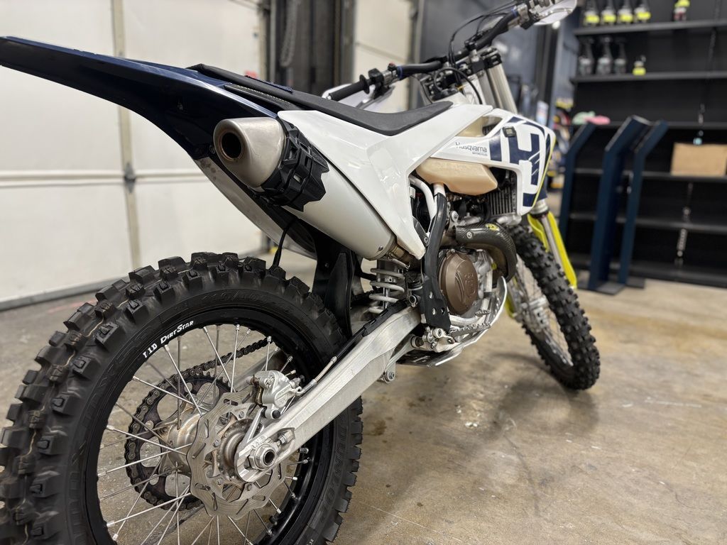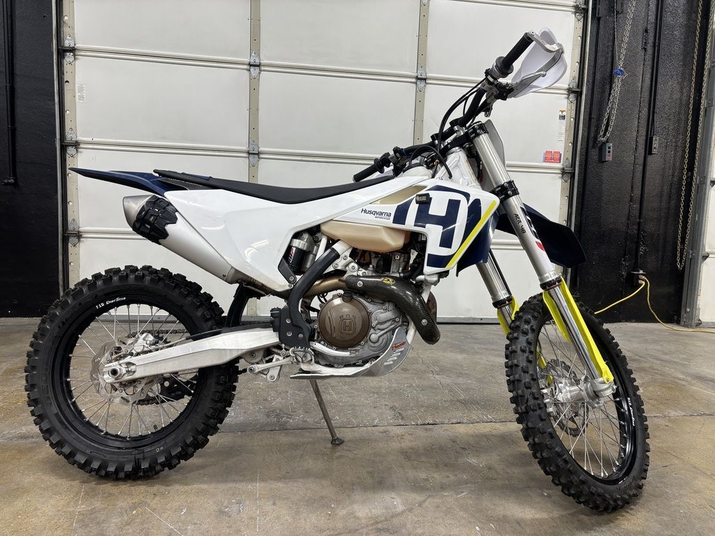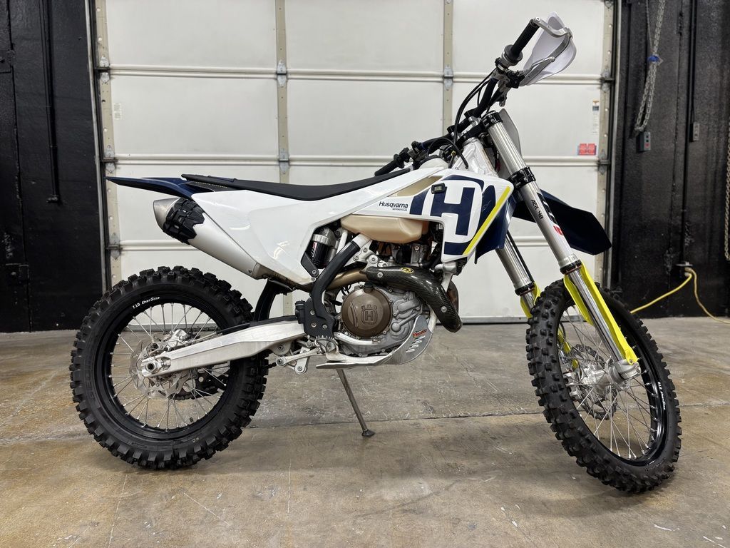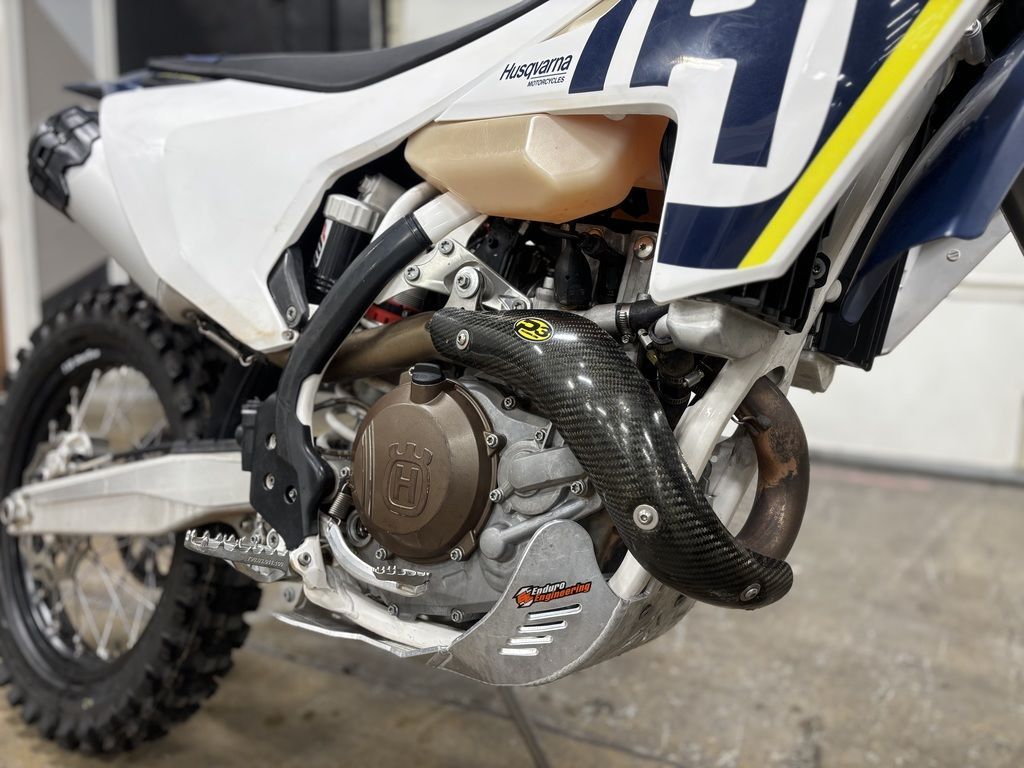 2018 Husqvarna® FX 450 CLASS-LEADING PERFORMANCE The FX 450 offers class leading performance in a lightweight, capable package. All aspects are designed to offer exceptional performance in conjunction with rider comfort and ergonomics making the FX 450 equally appealing to amateur and professional off-road riders alike. Traction control, map select and WP AER 48 forks are just a few of the standard features which ensure the FX 450 embodies premium quality and feel. Features may include: Engine The SOHC engine is the perfect example of the advanced engineering techniques used by Husqvarna motorcycles offering a peak power of 63 hp at an overall weight of just 61.3 pounds. Mass-centralization is key in the engine design, enabling chassis engineers to position the engine closer to the center of gravity for optimal handling and maneuverability. Crankshaft The inertia produced by the crankshaft is carefully calculated to deliver optimal traction and ride-ability from the powerful 450 cc plant. The crankshaft is specifically positioned to harness the rotating mass in the ideal center of gravity resulting in a lightweight and agile handling feel. A plain big end bearing comprising of two force-fitted bearing shells ensure maximum reliability and durability, guaranteeing long service intervals of 100 hours. Crankcase The crankcases are designed to house the shaft arrangements and internals of the engine in the position that offers the best possible centre of gravity. Additionally, the position of the clutch shaft keeps the clutch above the oil level resulting in decreased friction and increased efficiency. Integrated cooling system The radiators are expertly crafted by WP Performance Systems using high strength aluminium. CFD (computational fluid dynamics) is utilized to channel air through the radiators more efficiently and provide optimal cooling in all conditions. The cooling system is integrated into the frame increasing heat dissipation by channelling coolant through the frame while eliminating the need for additional hoses. Additionally, the radiator protectors do not only protect against flying debris but also act as a brace divert any energy from an impact around the radiator and into the frame. Chromoly steel frame The hydro-formed, laser-cut and robot-welded frame expertly crafted by WP Performance Systems is specifically designed with calculated parameters of longitudinal and torsional flex. Aluminum engine mountings benefit suspension functionality and feeling while retaining a light, compact and strong package. The frame is finished off with a premium white powder coating and standard frame protectors guaranteeing supreme protection and durability. Composite carbon fibre subframe The composite subframe is a design unique to Husqvarna showcasing pioneering technologies and innovation. This 3 piece component is made up of 30 % carbon fiber making it remarkably light (1.4 kg) and also particularly strong. Specific care is taken to create a certain rigidity for optimal handling and rider ergonomics. Magura hydraulic clutch The reliable, high quality, German-made clutch system guarantees even wear, near maintenance-free operation and perfect modulation in every condition. Meaning that play is constantly compensated so that the pressure point and function of the clutch remain identical in cold or hot conditions, as well as over time. Magura braking system New for MY18 is a Magura front and rear braking system. The system features a similar layout to the previous design with improved sensitivity for a more modulated feel while still retaining the highest level of performance. 260mm disc front and 220mm rear.