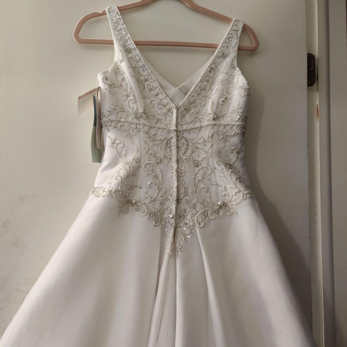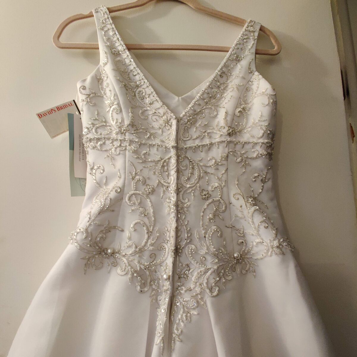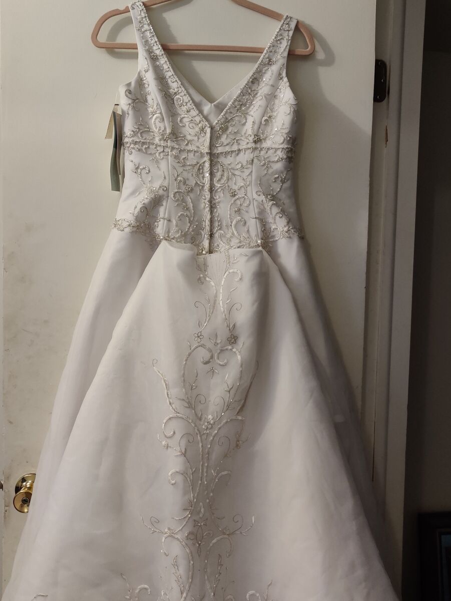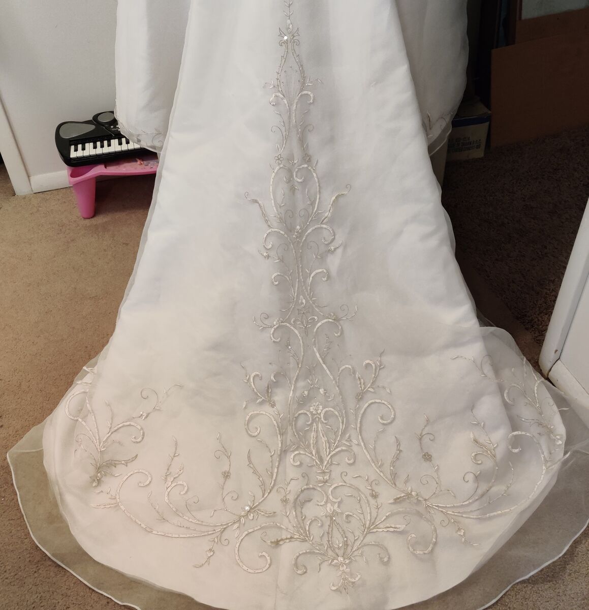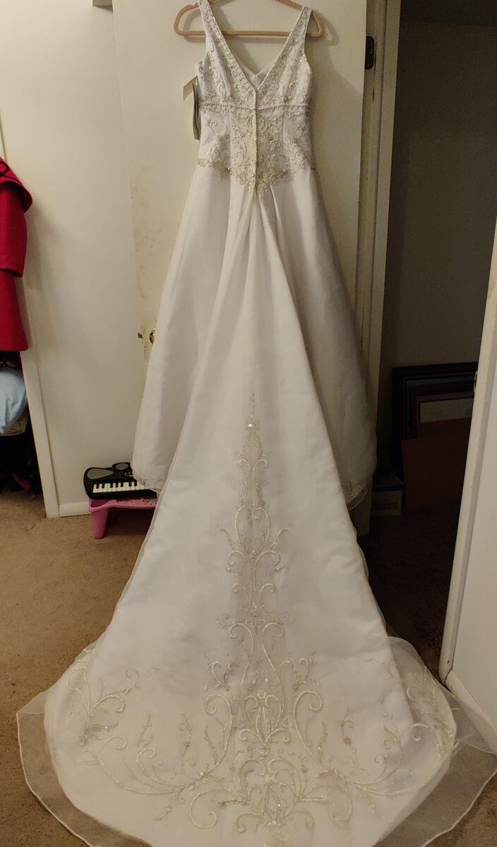 ZelleBeautiful wedding dress in satin and beads. The train can be tacked up. It has been kept in the garment back to protect it. Price is firm