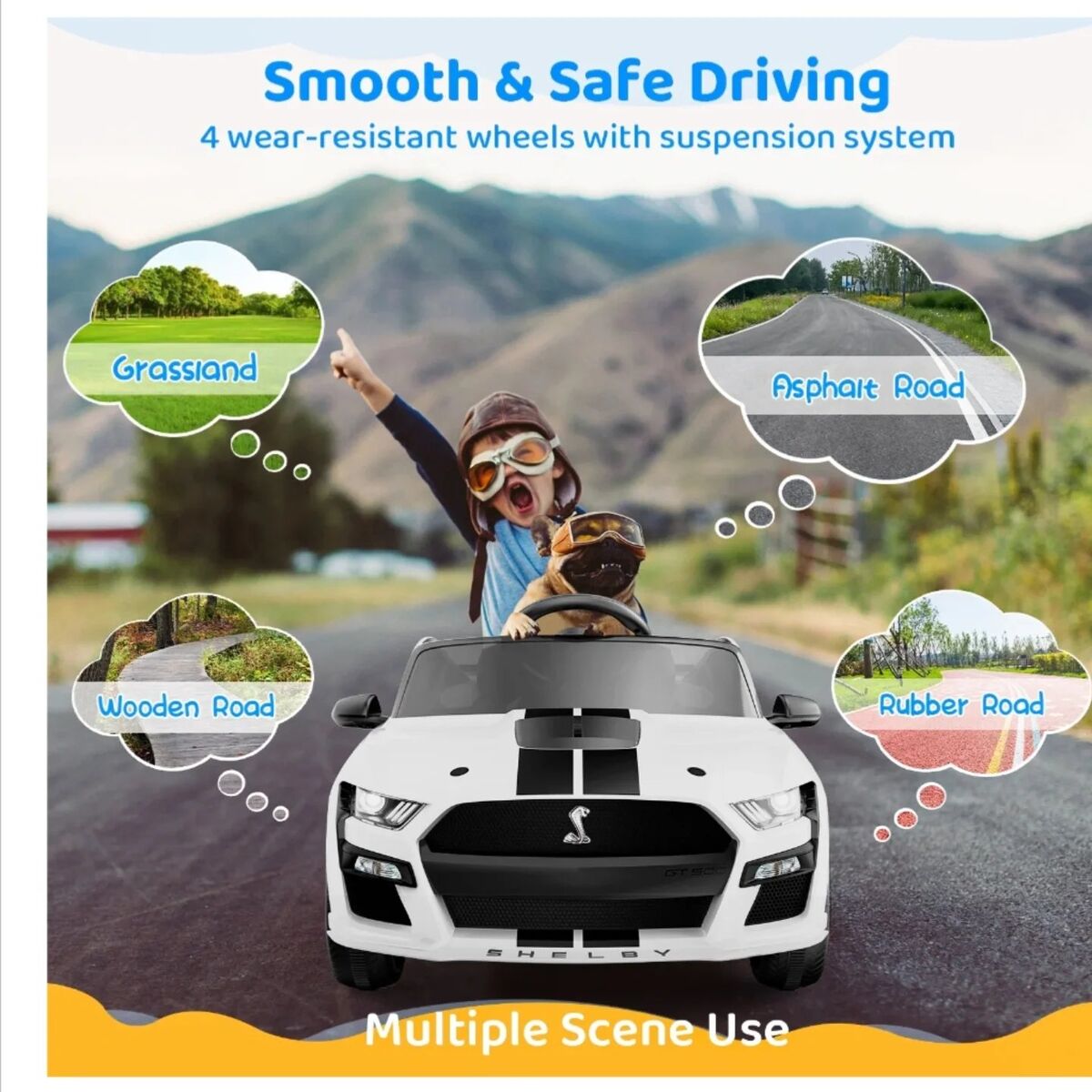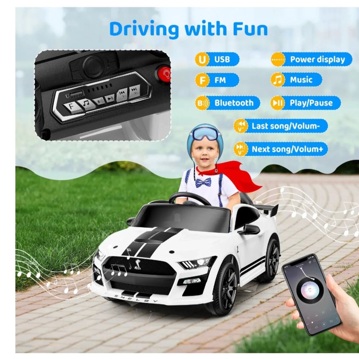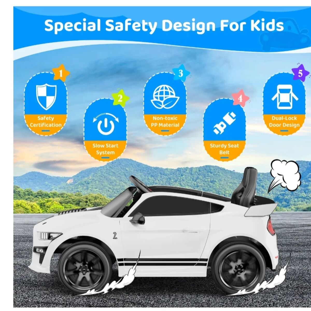 [Officially Licensed Ford Shelby GT500] This officially licensed children's electric car is designed with a 1:1 scale replica, replicating every detail of the real car. Featuring a one-button start design, authentic engine sounds, and LED lights, 12v ride on toys provides children with a realistic driving experience. [Multi-Scene Use] Equipped with a soft start function and anti-slip tires, this electric ride-on toy car ensures smooth acceleration on various surfaces, including brick roads, asphalt, wooden floors, and plastic tracks. Your child can enjoy driving and playing indoors or outdoors with ease. [Dual Drive Modes] 1.Kids can operate the electric car independently through the pedal and steering wheel, enjoying two different speeds. 2.Parents can control the baby car's three speeds via the 2.4GHZ remote control, which boasts priority control function. Pressing the "P" button will activate the emergency stop function, allowing you to enjoy the fun of being with your baby. [User-Friendly Safety Design] Crafted with non-toxic PP plastic and sturdy steel, this toy car boasts a spring-loaded suspension for shock absorption and comes equipped with adjustable safety belts, double-locking doors, and wear-resistant, anti-slip power wheels. Certified for safety by ASTM, it's the ultimate holiday gift for your child. [Fun Entertainment Features] This Ford Shelby GT500 toy car is a surprise gift that will undoubtedly bring joy to your child. Equipped with an easy-to-use control panel, FM and MP3 players, Bluetooth music, USB connectivity, and forward/reverse functions, Let your child groove to their favorite music while driving, enjoying endless fun!