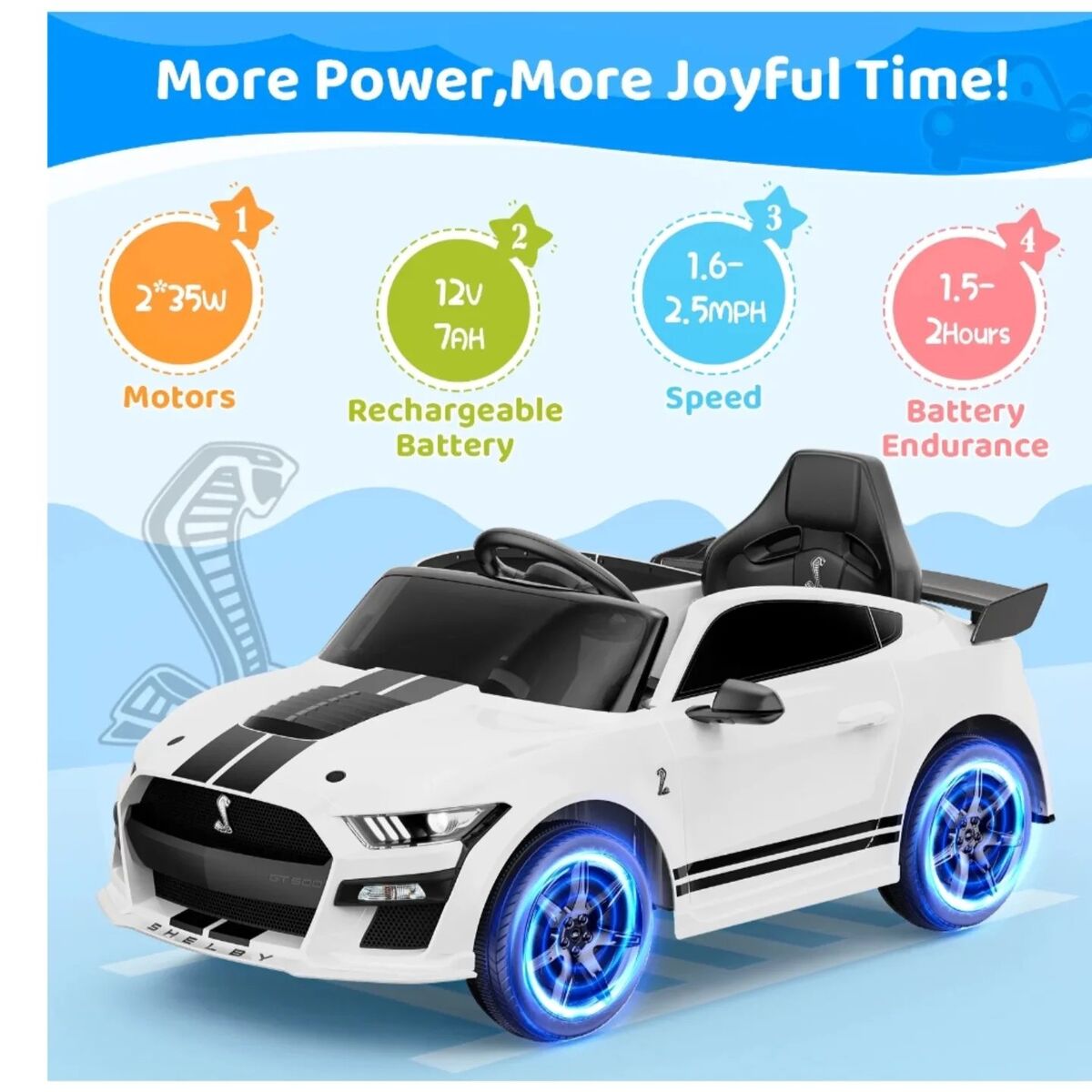The 12V7AH battery-powered Licensed Ford Shelby Mustang GT500 Ride-on Car is the ultimate outdoor gift for children, boasting a realistic appearance and a powerful 2x35W motor. With a speed range of 1.6 to 2.5 MPH, this electric vehicle is ideally suited for boys and girls with a penchant for adventure, serving as the perfect choice to spark children's imaginations and encourage outdoor exploration. Our commitment is to provide high-quality toy cars that not only foster fun but also strengthen family bonds while ensuring safety. It's a trusted ally for parents seeking to enrich their children's playtime.