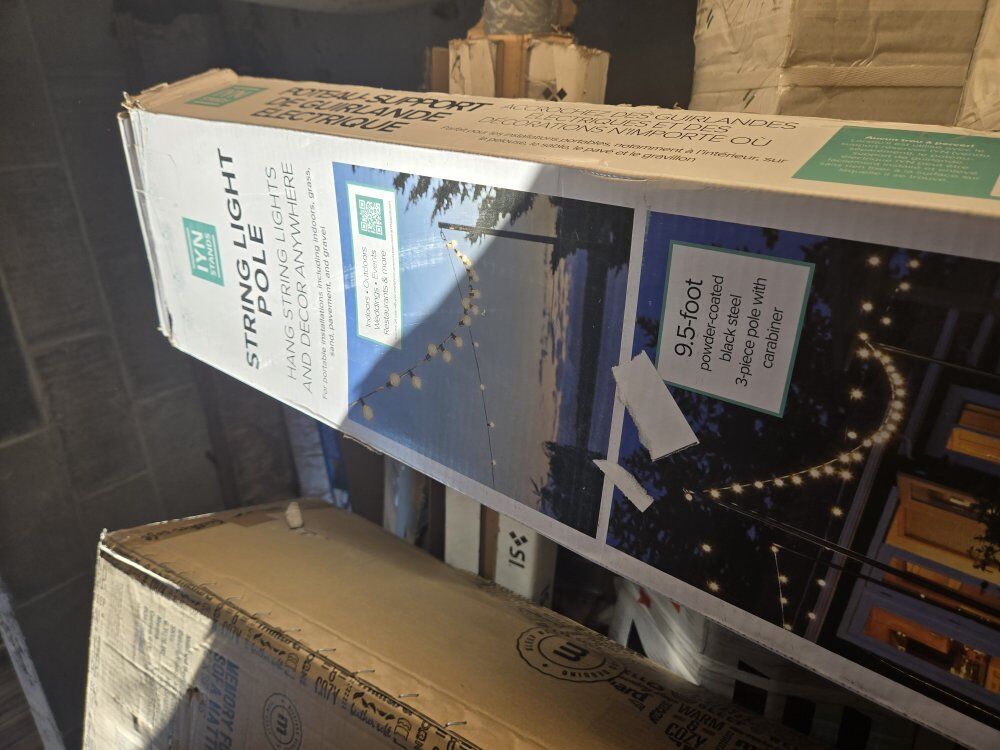 String Light Pole 9.5' powder coated black steel 3 piece Pole with carabiner. New still in box.