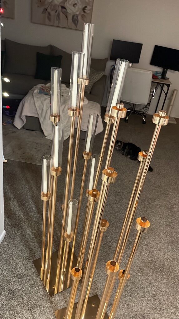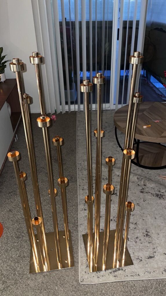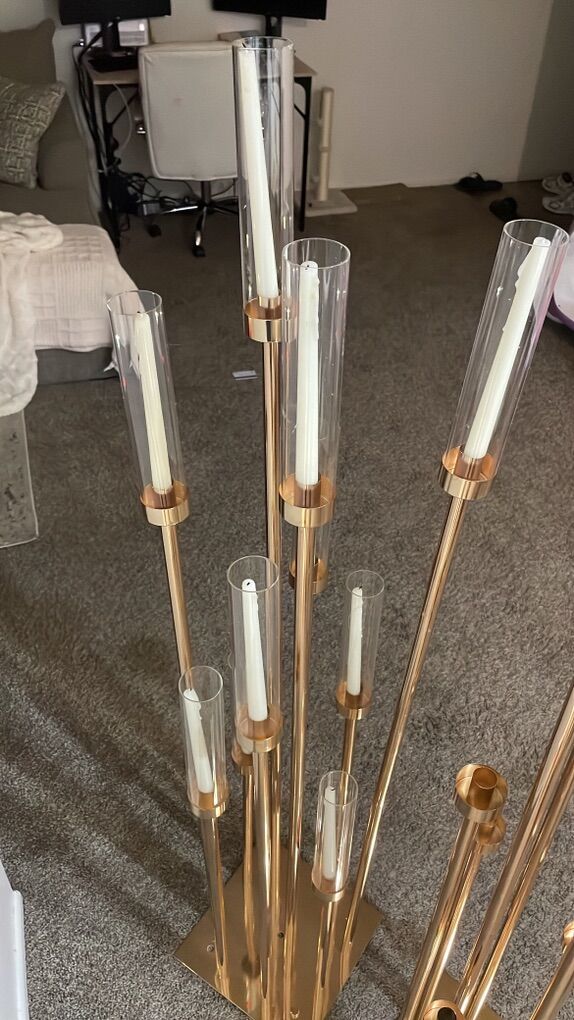Zelle57'' Gold 10-Arm Metal Holder Candelabra, Tall Glass Candle Holder, perfect for Weddings, Engagements, Showers, and Birthdays. Comes with box of taper candles. Can use LED candles. These can be used as centerpieces or on the floor. They come as a pair $75 8013008311