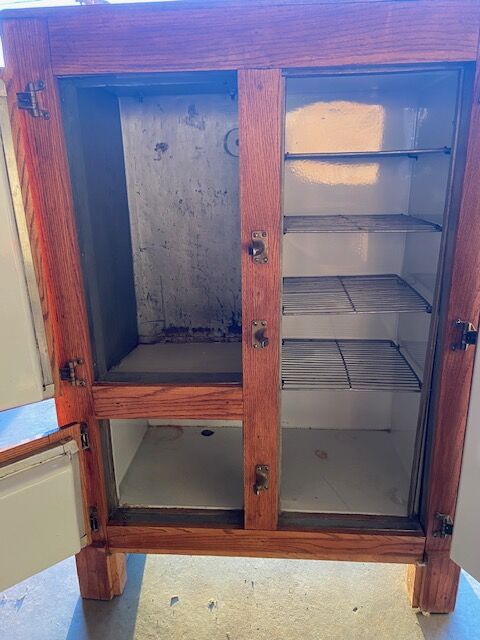 OLD OAK ICE CHEST 34 wide 48 tall x 19 deep Right door 13 wide x 37 tall Left side top door 13 x24 Left side bottom door 13 x12