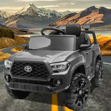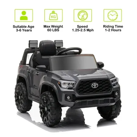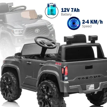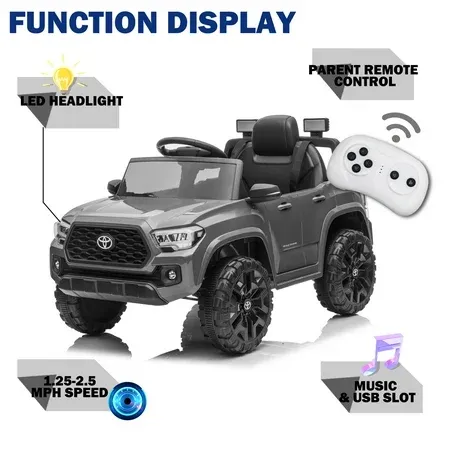 Multifunctional Kids Ride on Car Officially licensed Toyota Tacoma ride-on car looks just like the real truck. It's also very close to the full experience with LED lights, startup sounds,4wear-resistant wheels, storage space, MP3 player, AUX input, and flash drive port. This 12volts ride-on can also be connected to your smart device to play music or a variety of audio files. There are also doors that fully open and close to deliver an authentic driving experience that kids are sure to love. 2 DRIVING MODESPush-button start, choose between forward or reverse gear and high or low driving speed. Accelerate by pressing the foot pedal, and maneuver by turning the steering wheel. Let your child drive by themselves, or you can control the ride-on by using the 2.4G remote control to safely guide them. The remote control is equipped with forwarding/reverse/park controls, steering operations, and 3-speed selection with speed range is 1.5 to 2.6 MPH. SAFE & DURABLEThis electric truck is made with durable and non-toxic plastic featuring ASTM certification for greater reliability. The combination of shock absorber spring tires, slow start design, adjustable three-point seat belts, and lockable doors offer better protection for your kids. BEST CHILDREN'S GIFTDon't think about what kind of gift to buy for children, this toy car will be the best gift for your child's birthday, Christmas, Children's Day, or Halloween holidays. Let children have fun driving this car!