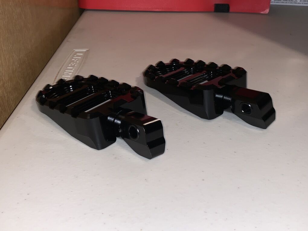 ApplePayMZS Motorcycle Foot Pegs, Front Rear Footpegs MX Serrated Wide Driver Passenger Pedal Rest CNC Black Compatible with Scout 2015-2024 / Scout Bobber 2018-2024 / Scout Bobber Sixty 2015-2024. Never used or mounted. Sells on Amazon for about 65 dollars.