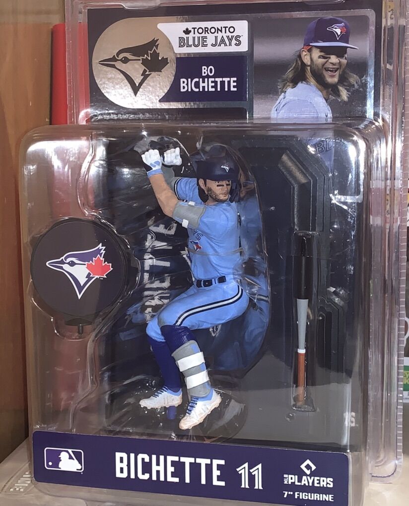 ApplePayMLB Toronto Blue Jays Bo Bichette McFarlane Platinum Edition action figure set includes the Standard version in the powder blue and the alternate CHASE Variant with the dark blue top, both are brand new in the box and boxes are in excellent condition.