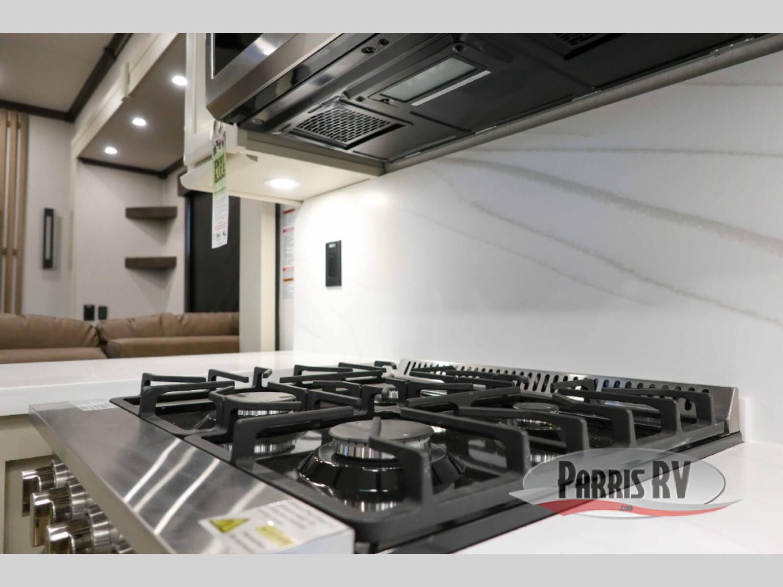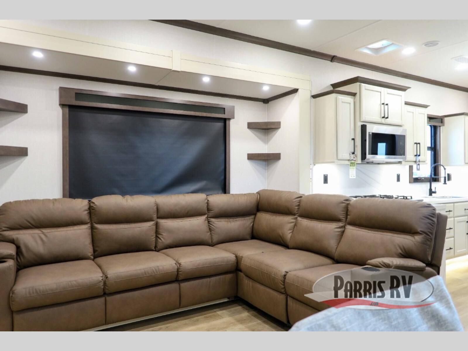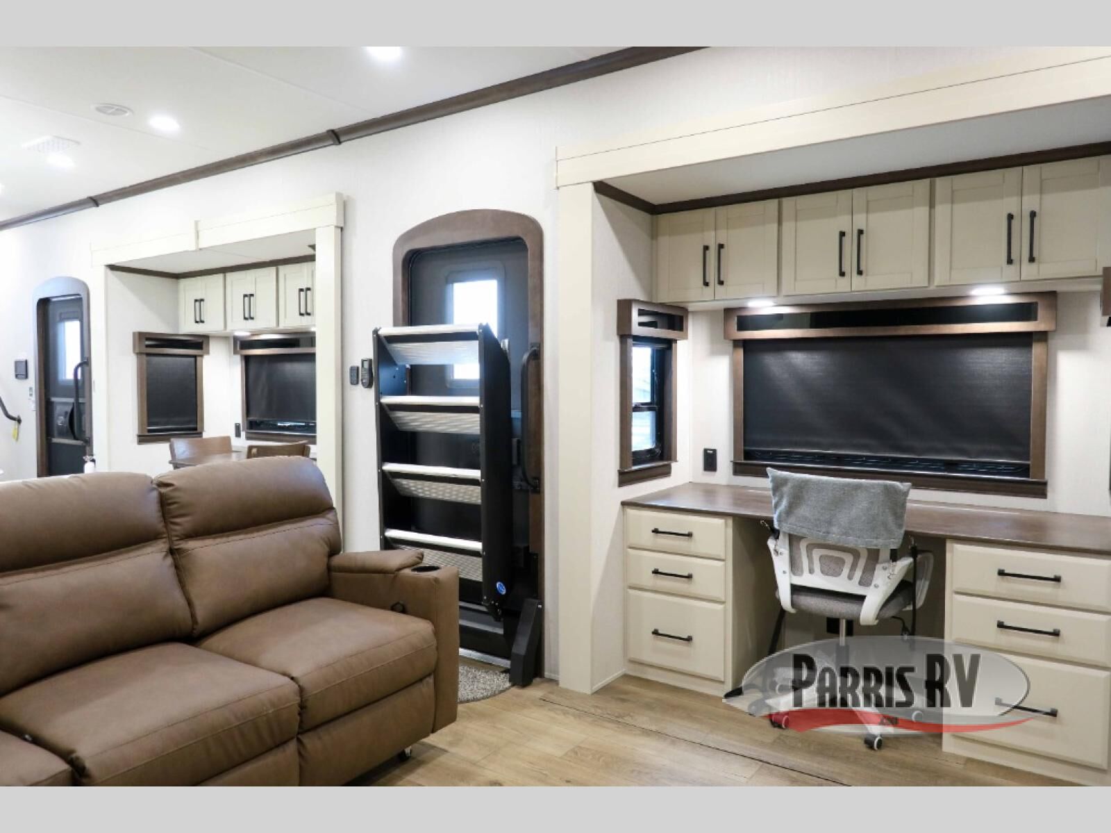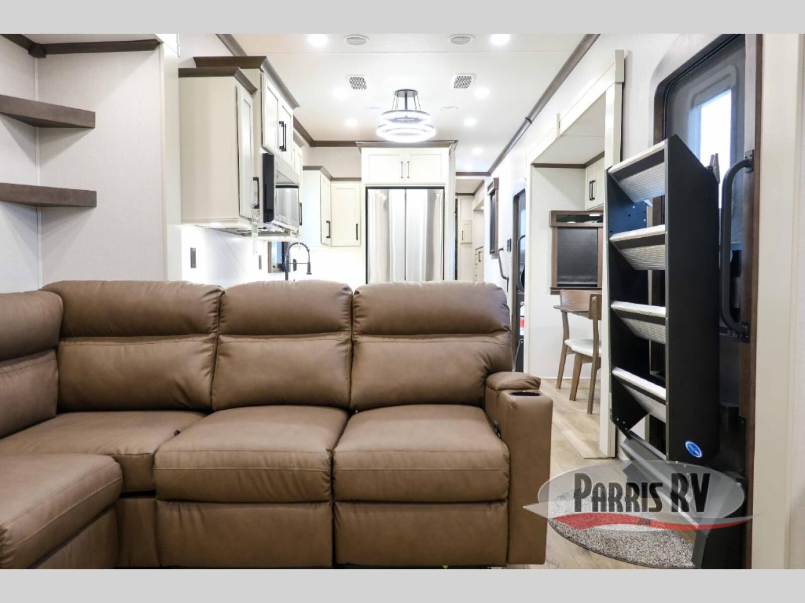 Step into luxury with this fifth wheel, where a high-end design, smart amenities, and functional living combine for an unmatched fifth wheel experience. As you enter you will find yourself in a spacious Kitchen for serious cooking: solid surface countertops, a full 18 cu. ft. french door refrigerator with ice maker, large stainless steel sink and residential-style faucet. Find yourself five slides that will create room for comfortable seating while you cozy up by the fireplace and watch your favorite movie or be as productive as you'd like with the slide out desk space. After a long day of travelling you will surely love to the front bedroom featuring a 72 x 80 king bed to finish your day with a good night's sleep.