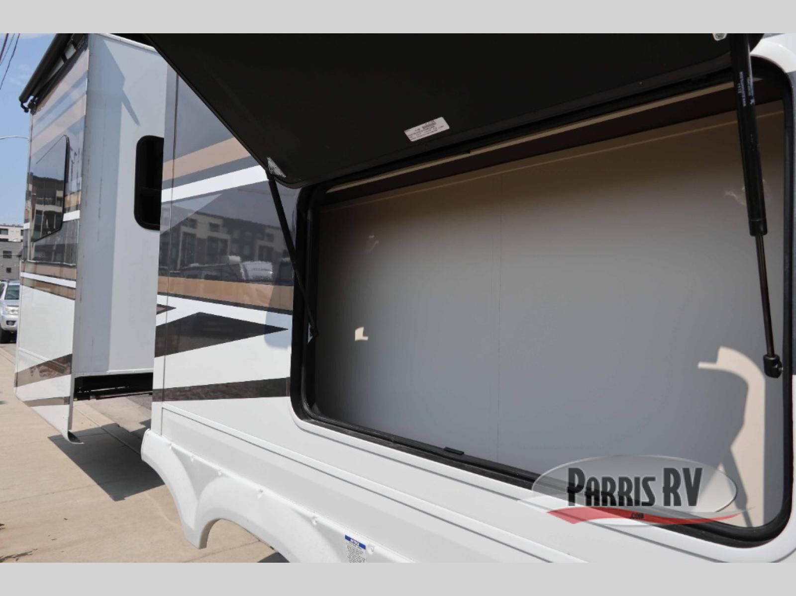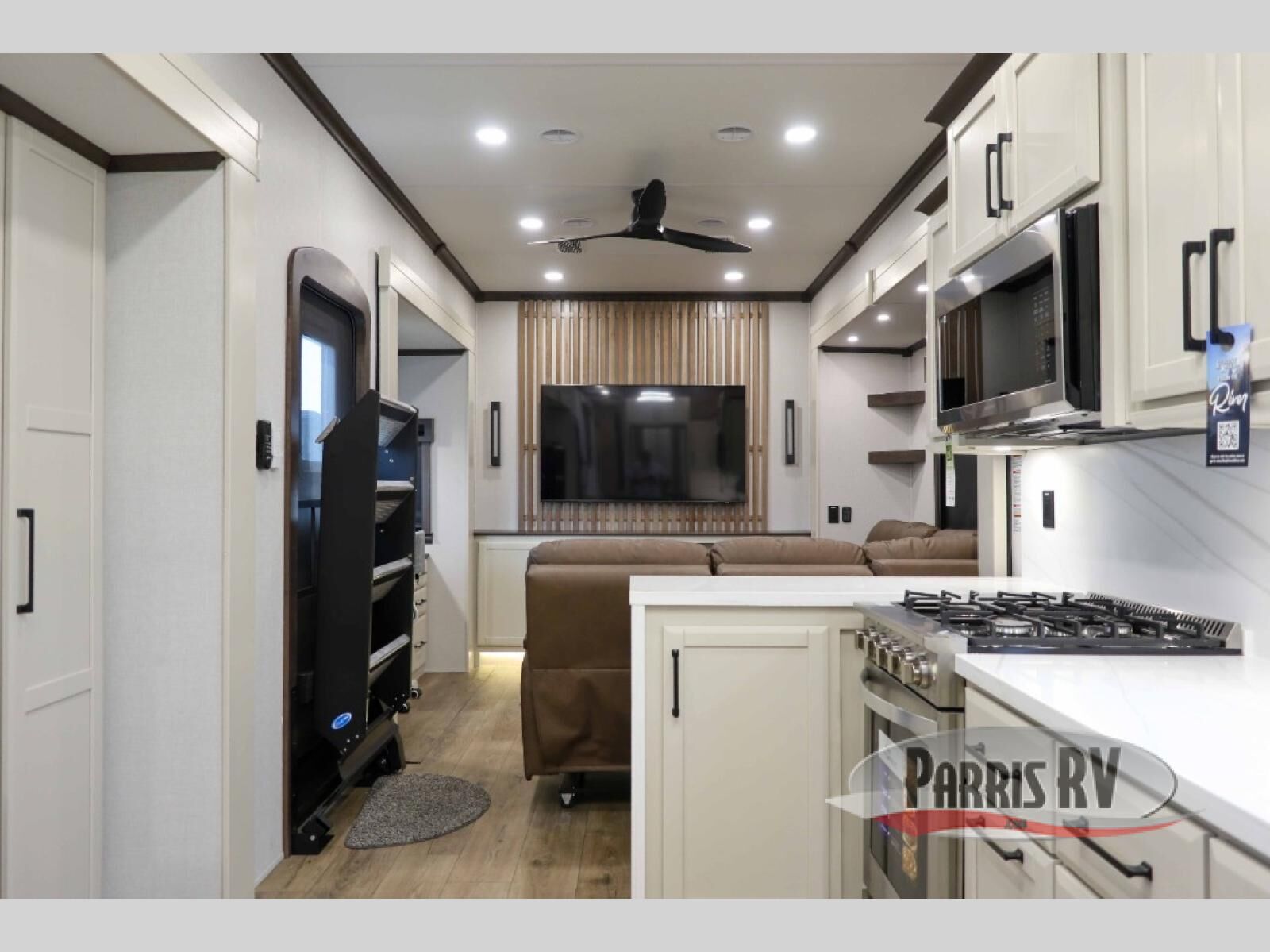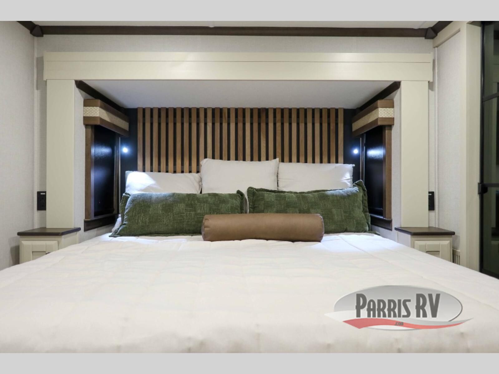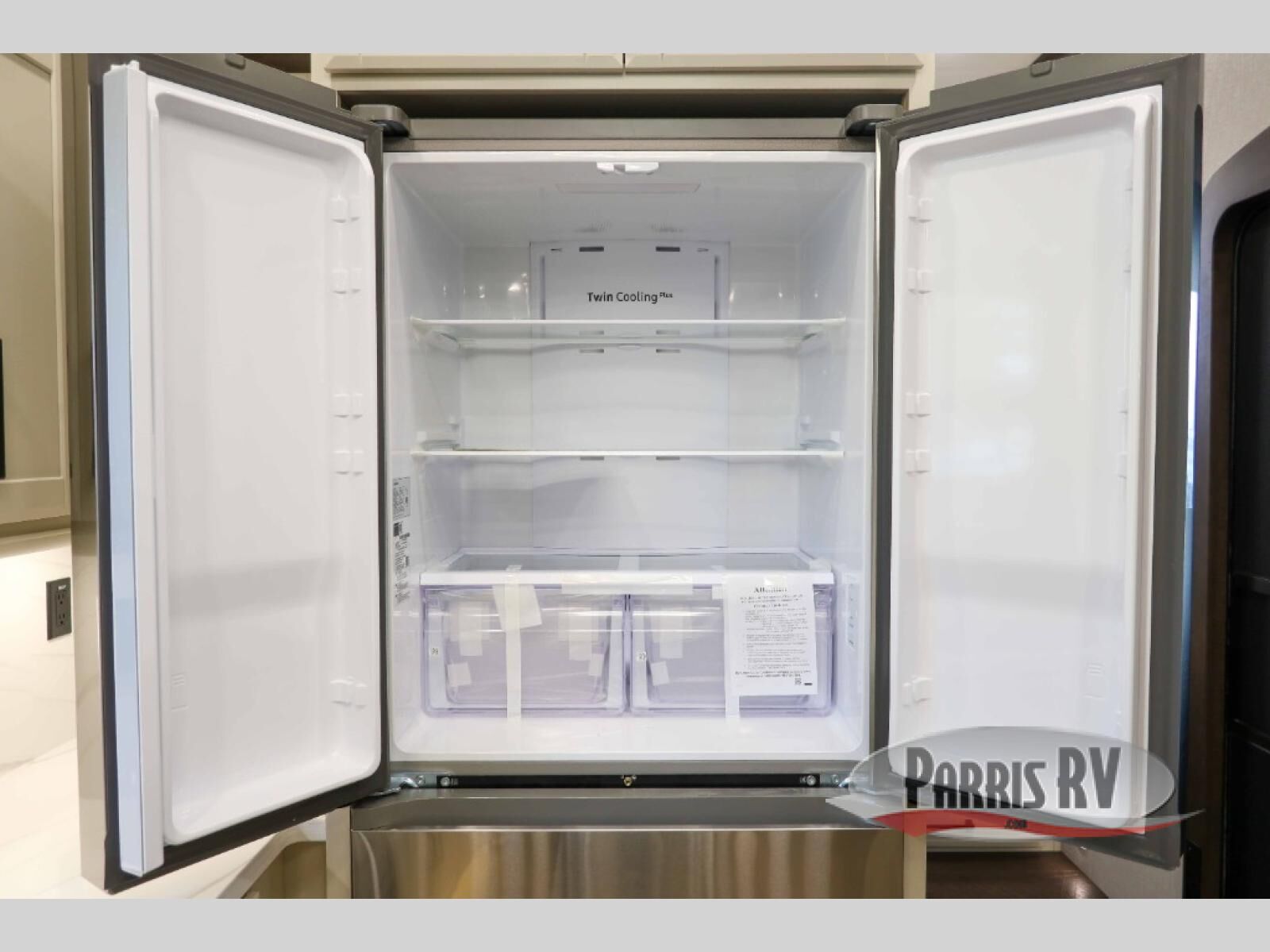 Step into luxury with this fifth wheel, where a high-end design, smart amenities, and functional living combine for an unmatched fifth wheel experience. As you enter you will find yourself in a spacious Kitchen for serious cooking: solid surface countertops, a full 18 cu. ft. french door refrigerator with ice maker, large stainless steel sink and residential-style faucet. Find yourself five slides that will create room for comfortable seating while you cozy up by the fireplace and watch your favorite movie or be as productive as you'd like with the slide out desk space. After a long day of travelling you will surely love to the front bedroom featuring a 72 x 80 king bed to finish your day with a good night's sleep.