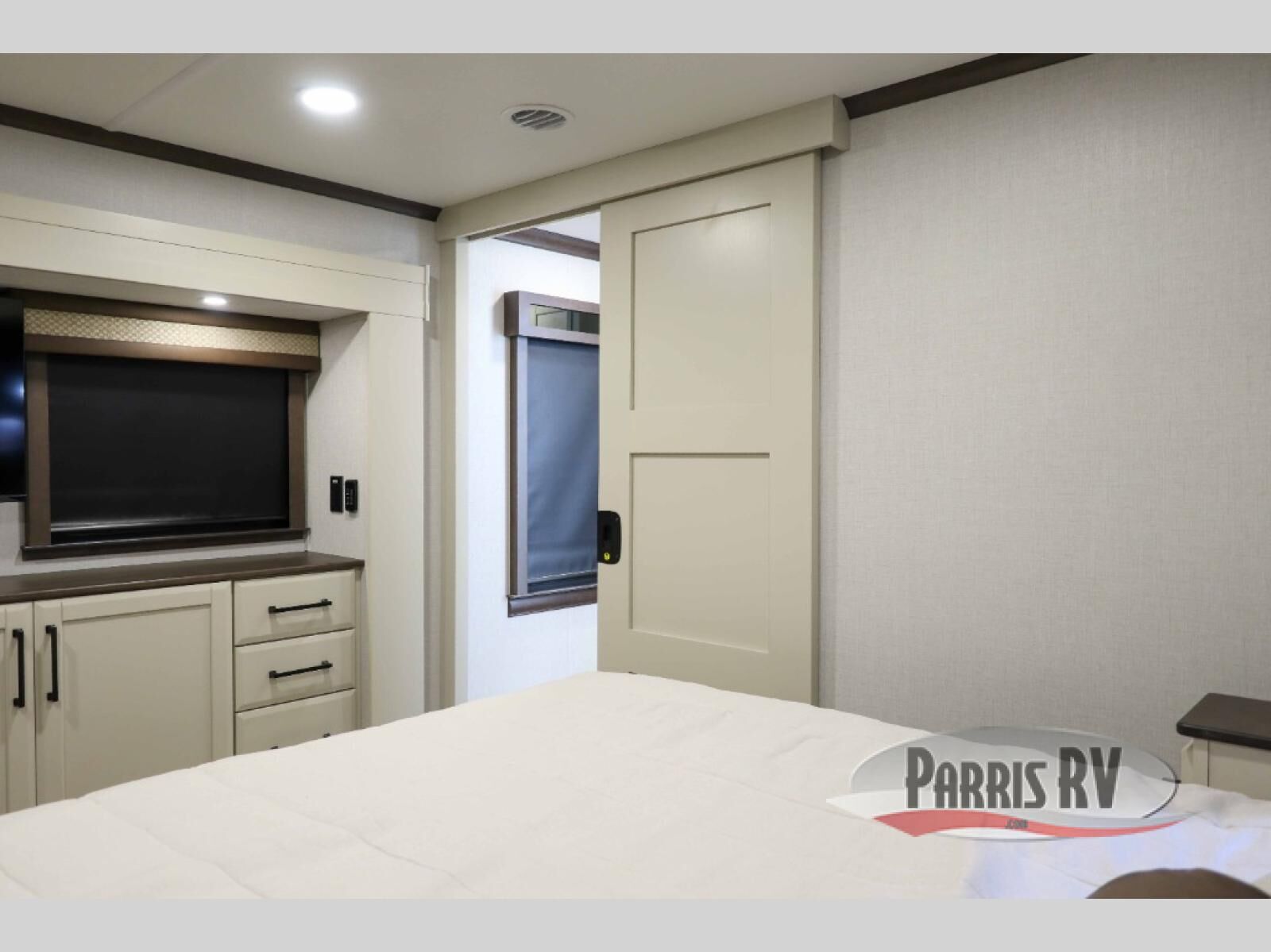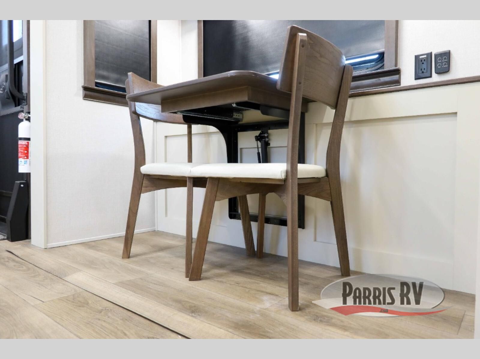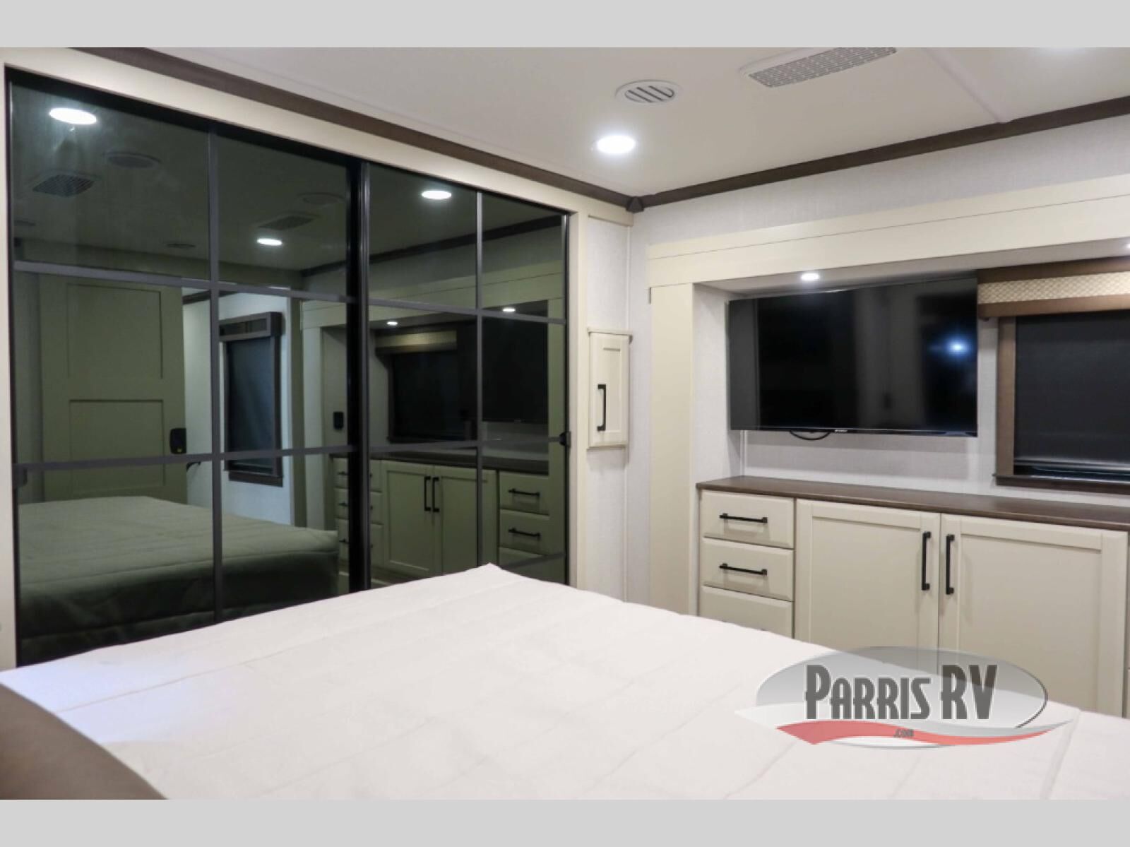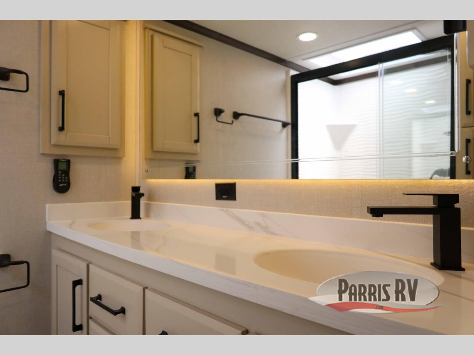 Step into luxury with this fifth wheel, where a high-end design, smart amenities, and functional living combine for an unmatched fifth wheel experience. As you enter you will find yourself in a spacious Kitchen for serious cooking: solid surface countertops, a full 18 cu. ft. french door refrigerator with ice maker, large stainless steel sink and residential-style faucet. Find yourself five slides that will create room for comfortable seating while you cozy up by the fireplace and watch your favorite movie or be as productive as you'd like with the slide out desk space. After a long day of travelling you will surely love to the front bedroom featuring a 72 x 80 king bed to finish your day with a good night's sleep.