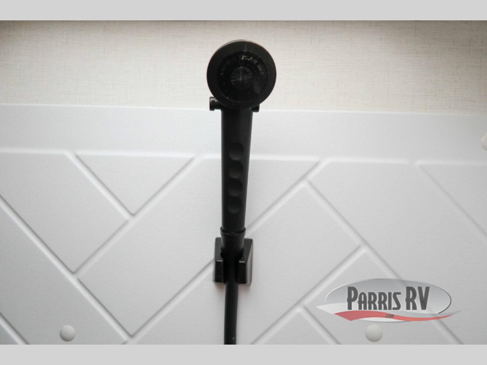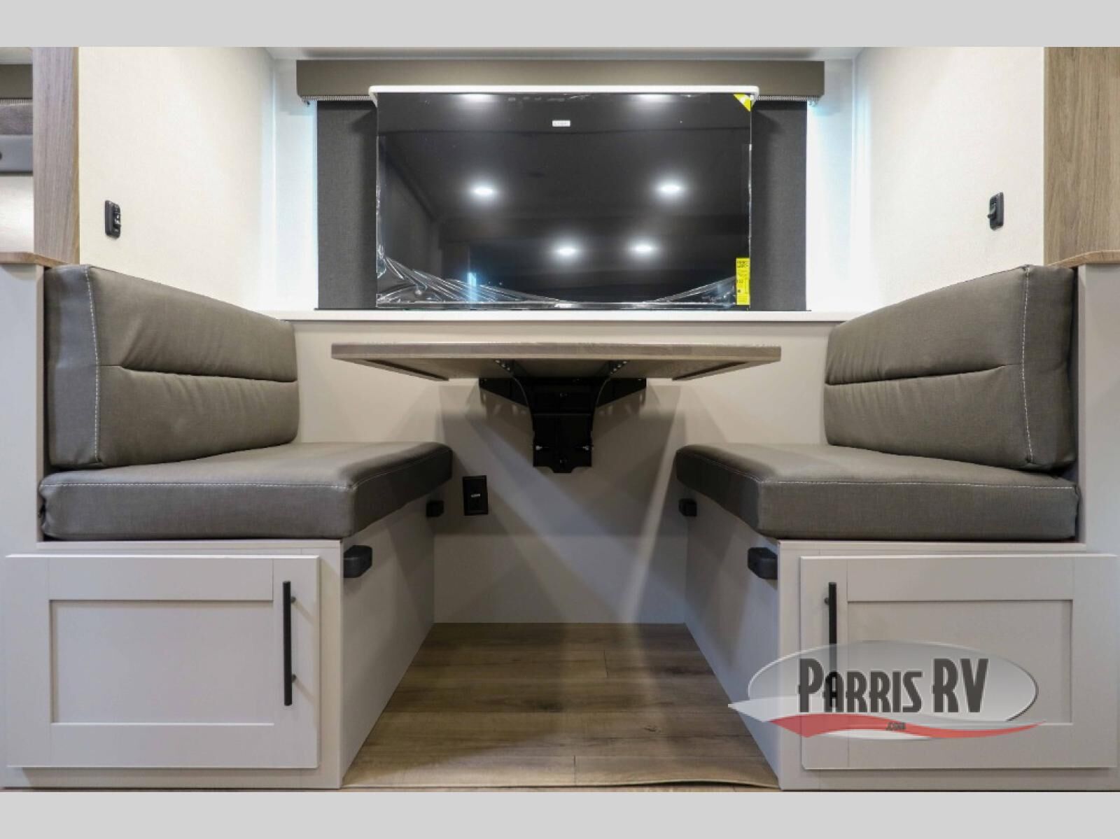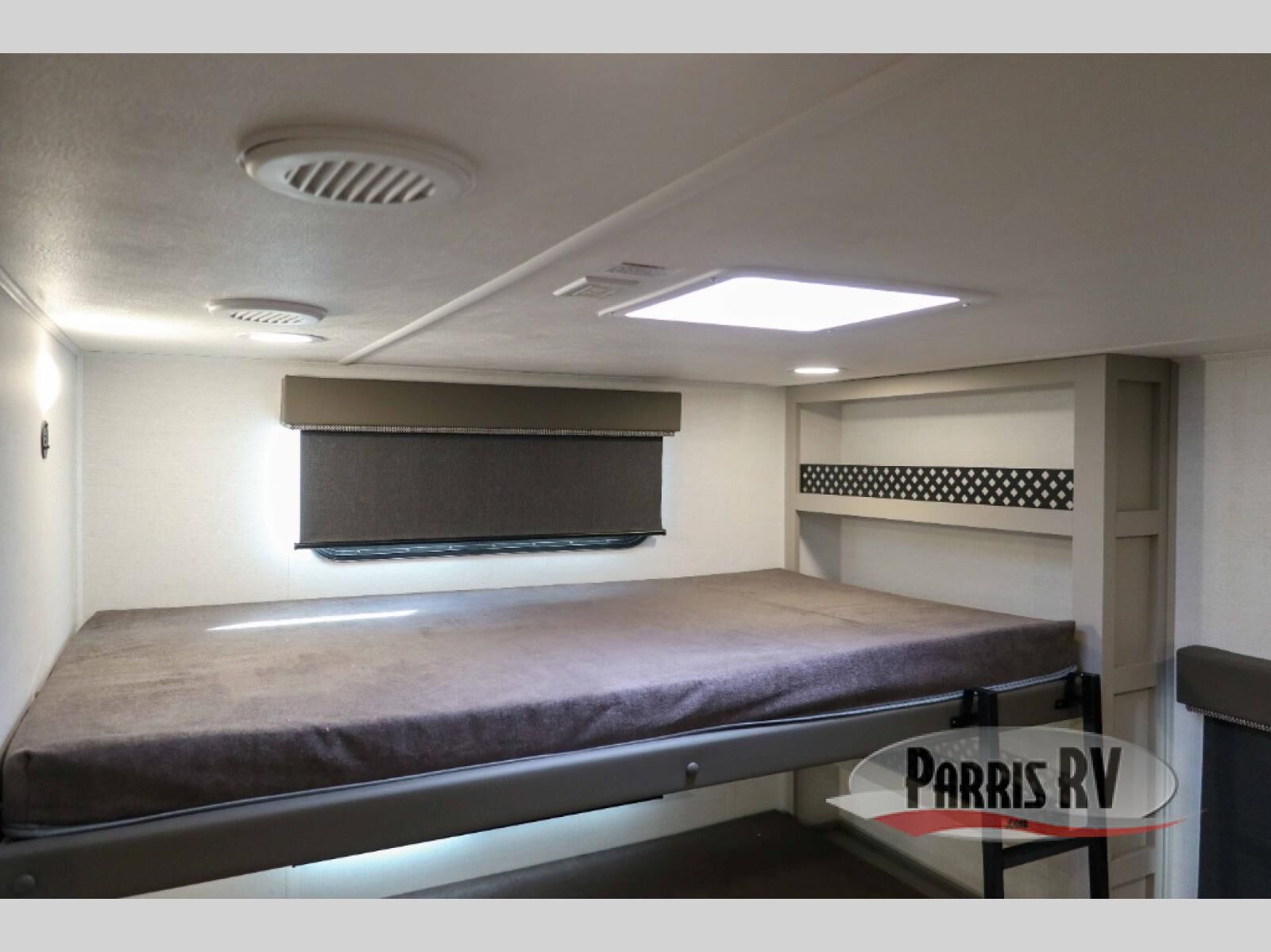Enjoy glamping in this spacious travel trailer for eight! Your guests or the kids will love the rear bunkhouse with 40" x 72" bunk beds across from a third bunk with a cube sofa below, and the slide out will make this space more open. The slide out also includes the booth dinette in the main living area, which is across from the sofa slide out. The chef will love cooking in this Delta kitchen with generous counter space, a 10 cu. ft. 12V refrigerator, plus pull-out pantry trays for dry goods and snacks. The full bath with a 30" x 36" shower and a soft close porcelain foot flush toilet will allow you to fresh up each day without having to use the camp's facilities. And don't overlook the front private bedroom with a queen bed, wardrobe nightstands, a third wardrobe plus overhead storage; now nothing has to get left behind!