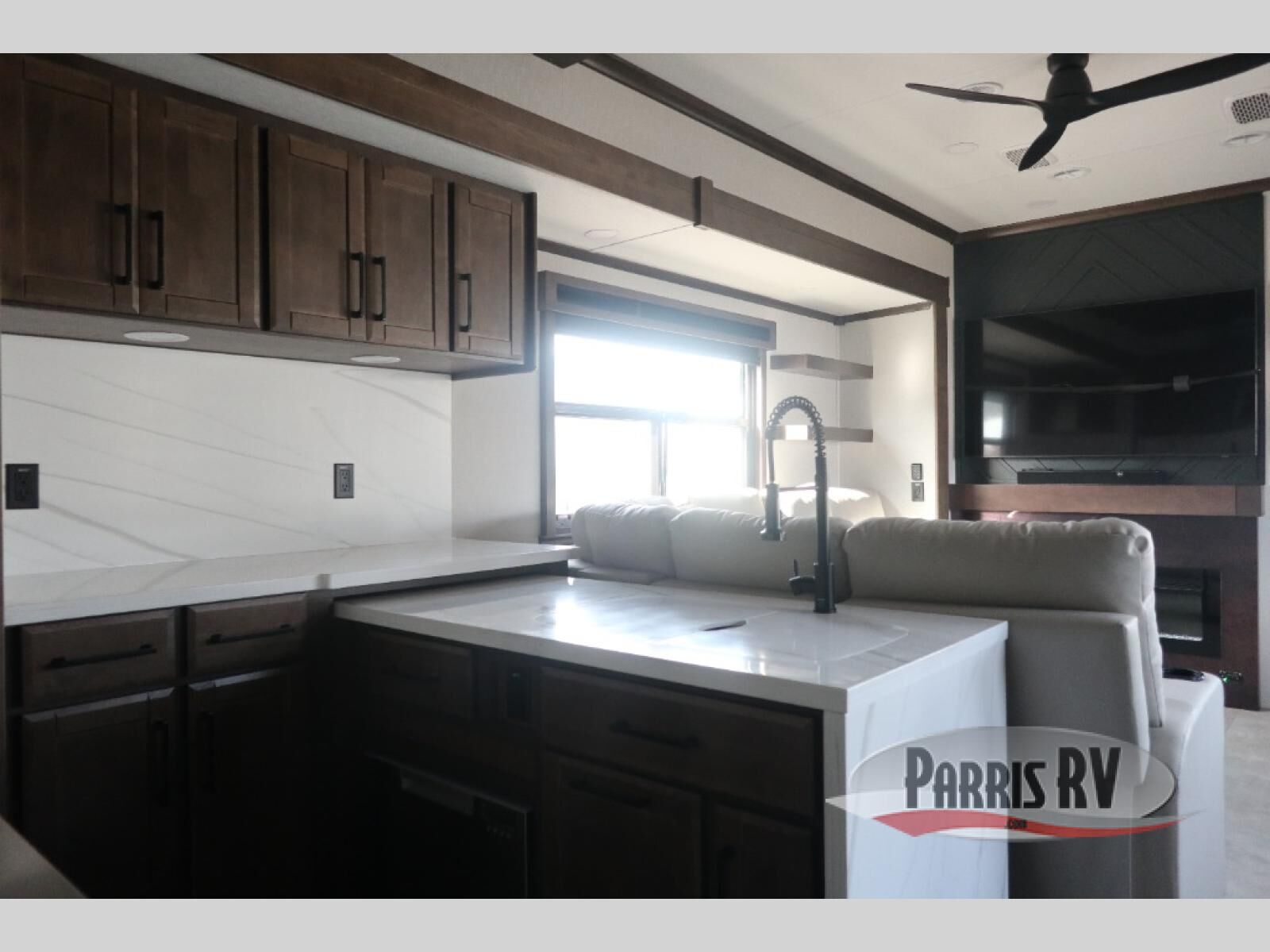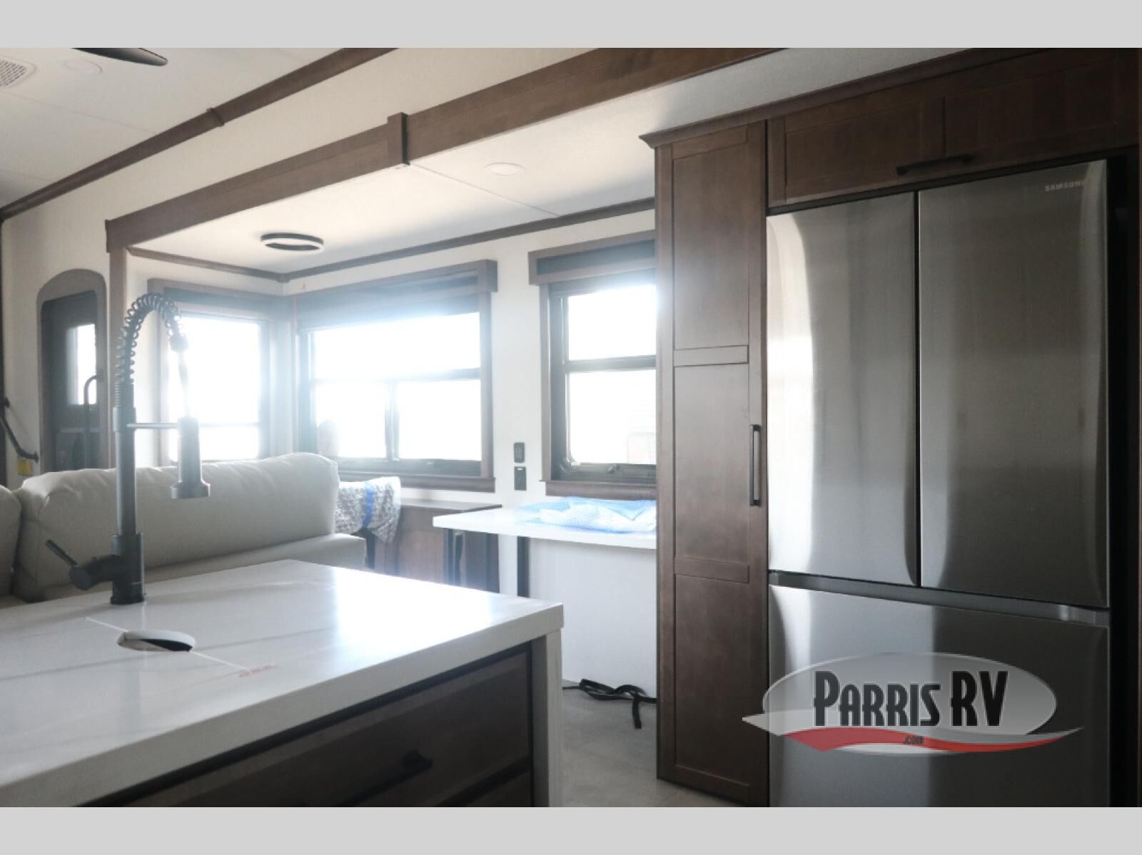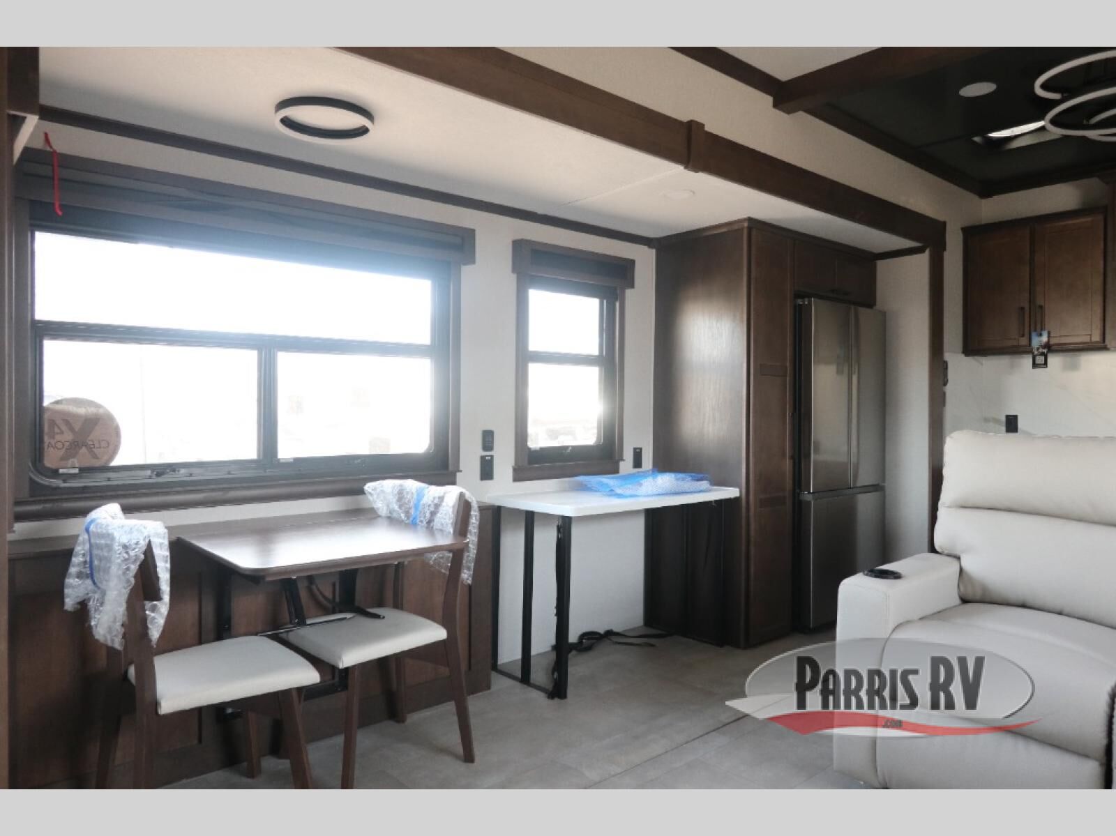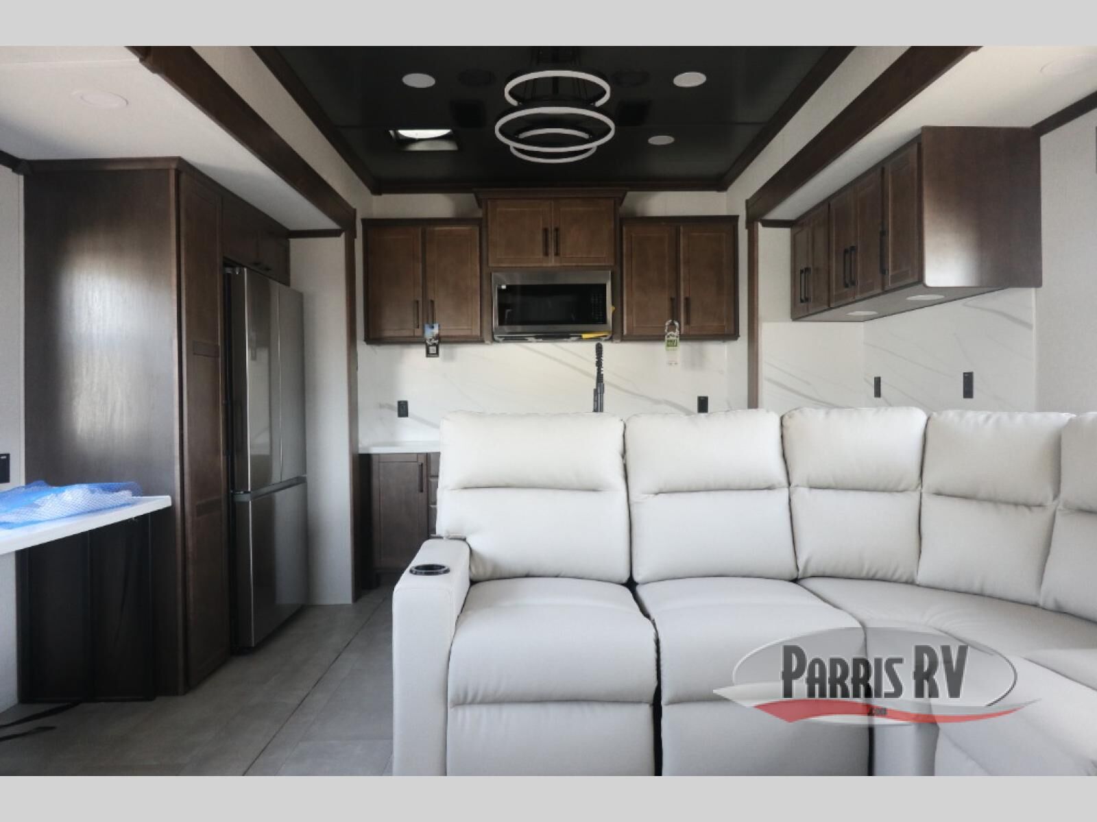 The RiverStone 43BFC isn't just another fifth wheel... it's a residential retreat designed for travelers who want every journey to feel like home. This impressive floor has a designated high-end kitchen space with tons of room, a large pantry, ample counter space and a lovely french door refrigerator will make for unforgettable meals on the go. You can also enjoy a great time with your partner and enjoy all the free time you want at the large sectional sofa you'll never want to leave! After enjoying the living room you will be fascinated by the primary bedroom suite that delivers a quiet, comfortable and spacious sanctuary featuring a dresser and dedicated shoe storage to organize all your personal belongings.