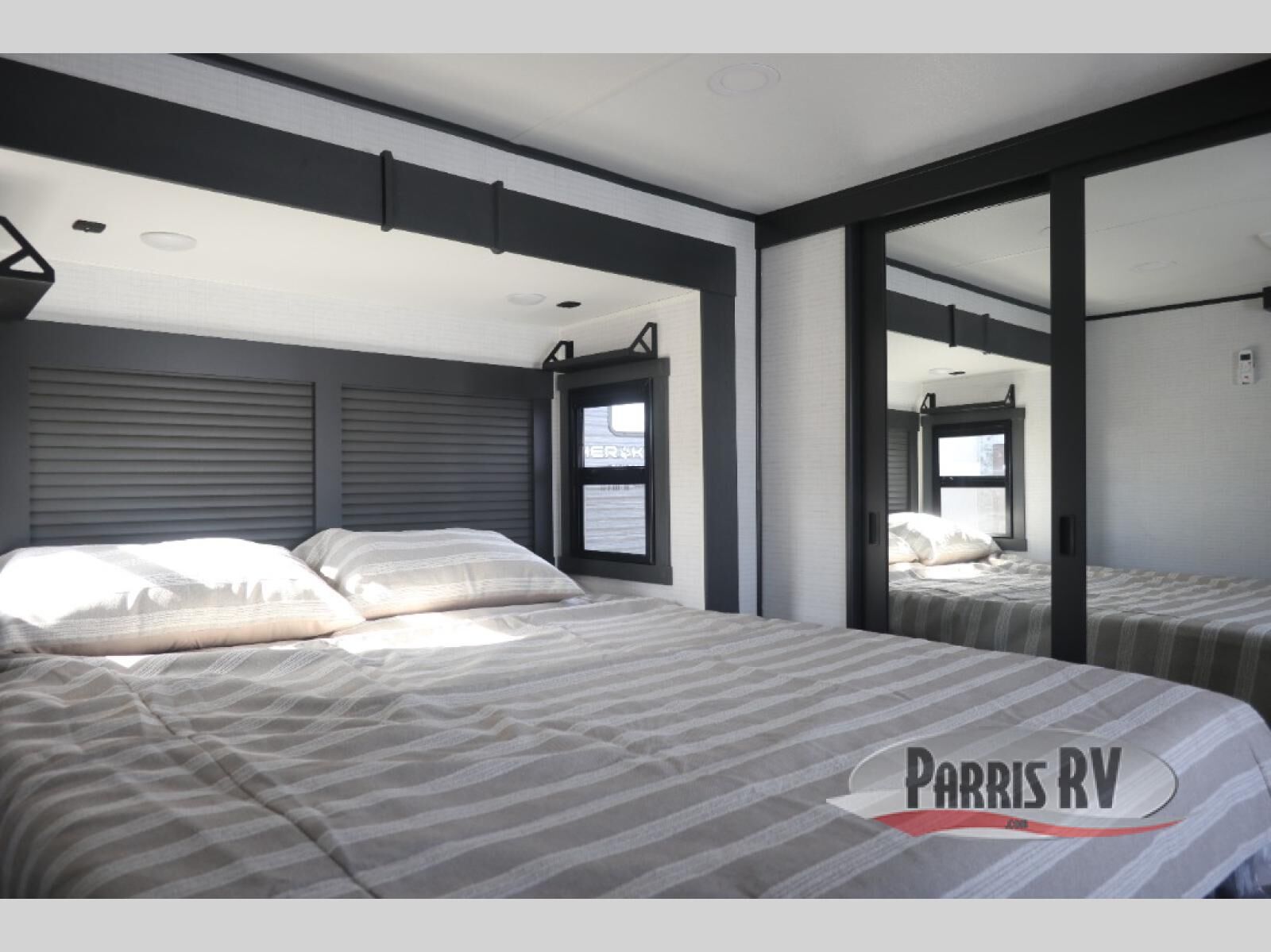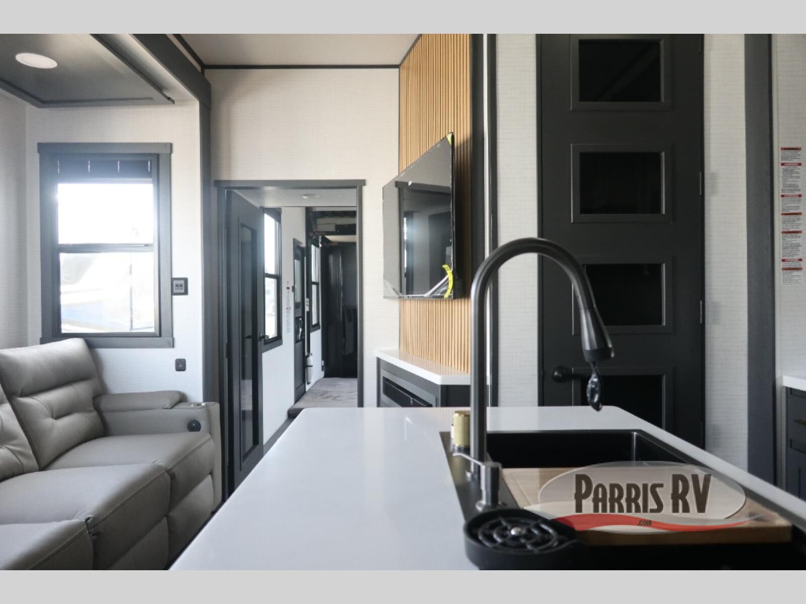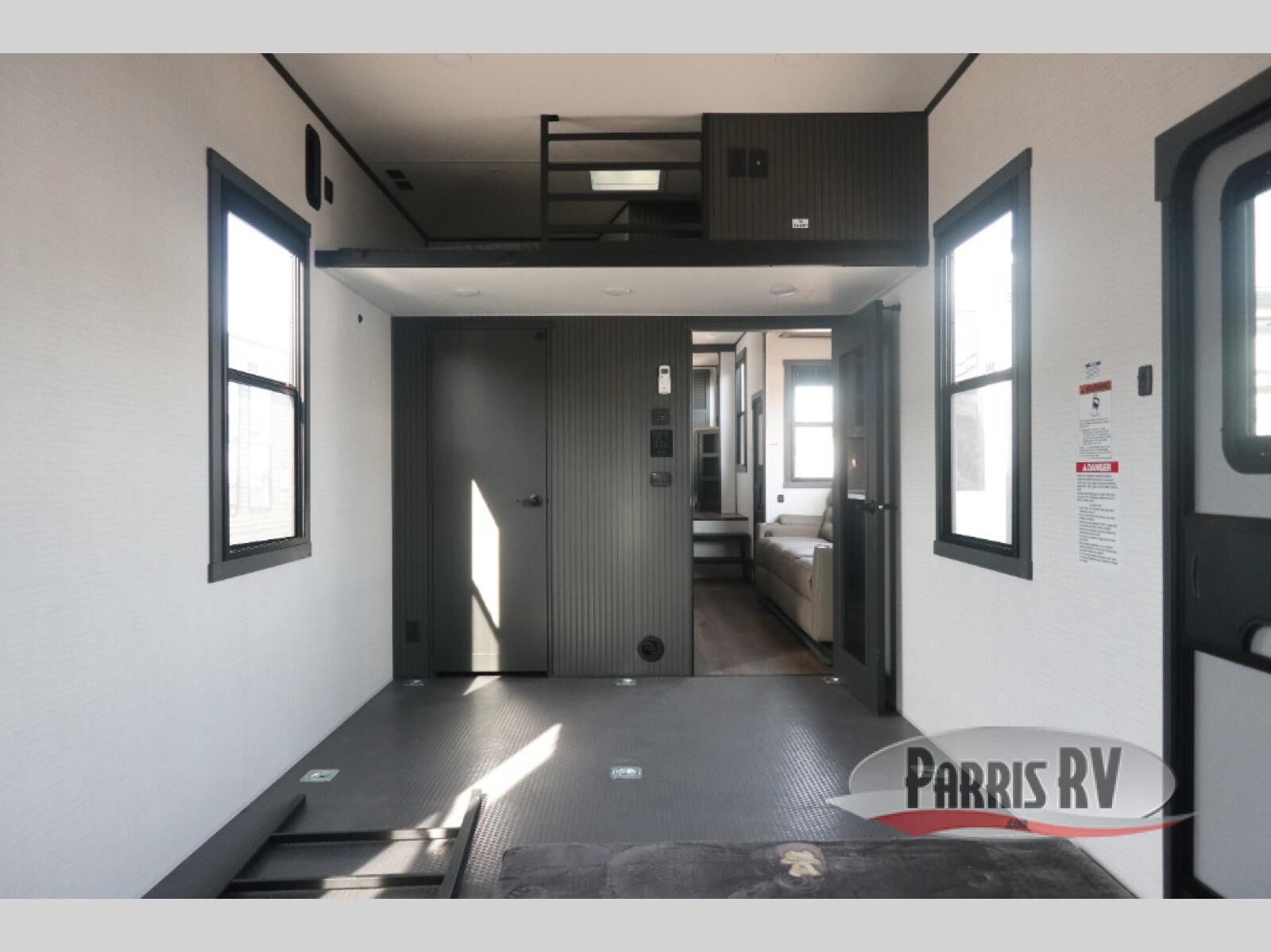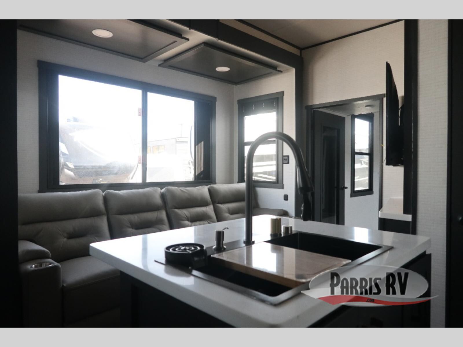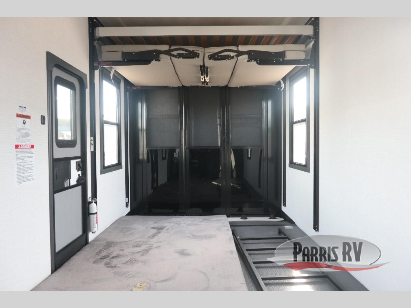 This 40G17 model is built for both adventure and comfort, starting with an expansive 17-foot garage that provides ample space for all your toys. Inside the garage, you'll find a versatile Happi-Jack dinette with a removable table, perfect for meals or hanging out, and a Happi-Jack queen bed system that offers additional sleeping space when needed. One of the unit's two entry doors is also conveniently located here along with a half bath. In the middle living area, one of the three slide-outs houses the large sofa, centered across a cozy fireplace and a 55-inch TV ideal for relaxing after a long day. The kitchen is designed for functionality, featuring an island with a double sink, a 16 cu.ft. refrigerator, microwave, and a large 20-cu.ft. pantry to keep all your snacks and essentials organized. Toward the front, you'll find the full bathroom and a private bedroom that includes a king bed, spacious wardrobe and dresser, offering plenty of storage for clothes and personal items, making this toy hauler the perfect home on the road.