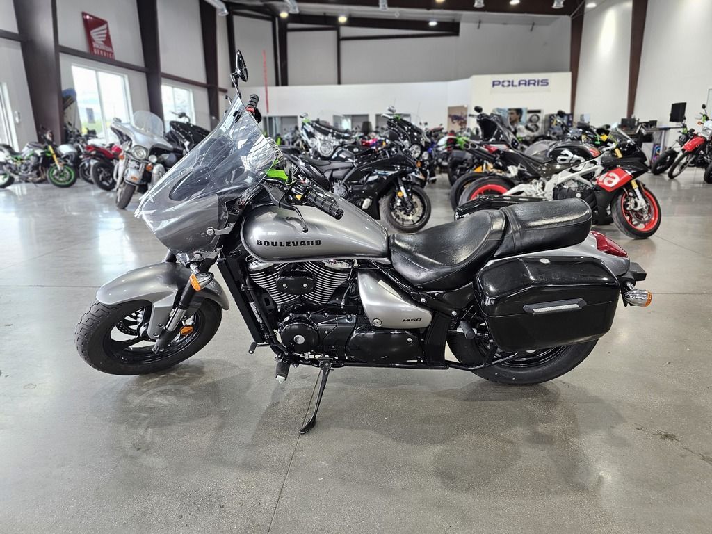 2016 Suzuki Boulevard M50 The Suzuki Boulevard M50 is a muscle cruiser with sleek styling that includes slash-cut mufflers, a hard-tail look, and low-rise bars. Wherever you ride, the M50 offers responsive handling and an exceptionally comfortable ride, thanks to its inverted forks, smooth, single-shock rear suspension and ideally designed saddle. Its 50-cubic-inch V-twin engine with advanced Suzuki fuel injection is equally impressive, producing a load of torque for strong acceleration in every gear. Features may include: Engine Robust 805cc (50 cubic inch) liquid-cooled, fuel-injected V-Twin powerplant is built to deliver exciting torque from down low in the rpm range. Smooth black finish on the engine and air cleaner covers complements the muscular presence of the V-twin’s finned cylinders. Crankshaft design features 45-degree offset crank pins to reduce engine vibration without a balancer shaft for a more comfortable ride. Electronic fuel injection system features the Suzuki Dual Throttle Valve System (SDTV) - maintains optimum air velocity in the intake tract for smooth low-to-mid rpm throttle response and high torque output. Multi-hole-type fuel injectors deliver a fine spray for a powerful yet fuel-efficient operation. Chassis Strong, double-cradle steel frame supports a chassis ready for cruising or a full-on tour. Link-type rear suspension connects to a truss-style swing arm and a single shock absorber with 7-way spring preload adjustability providing 4.1 inches of smooth and response suspension travel. Large 300mm front brake rotor and rigid caliper bring strong braking performance to match the engine’s output. Suzuki performance-cruiser styling is sleek and flowing throughout from the distinctive headlight cowl to the purposeful tail section. Drag-style handlebars mounted on pull-back risers provide a comfortable reach for the rider and increased comfort around town or on the highway